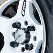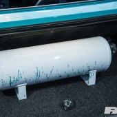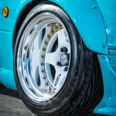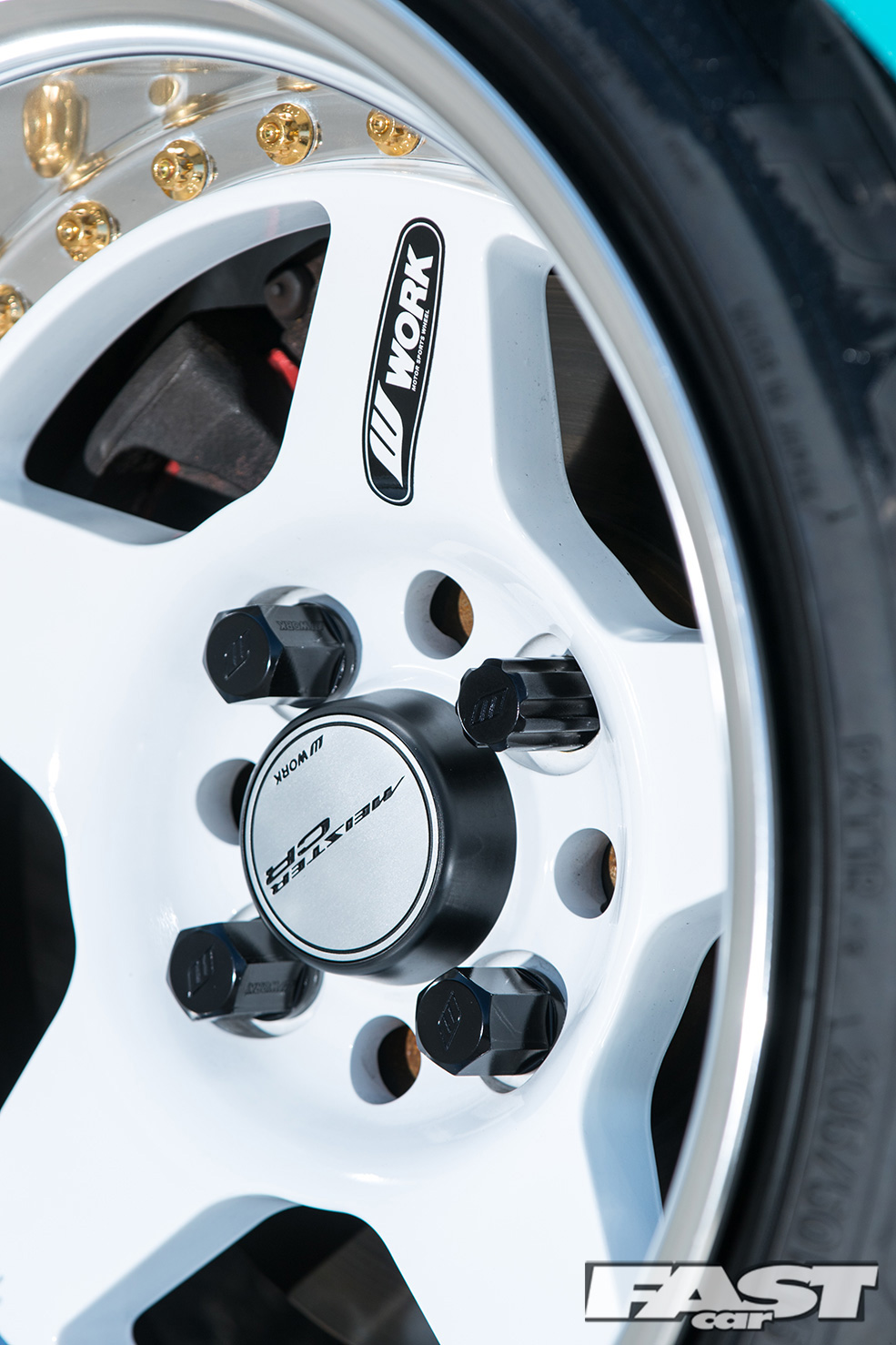 Work CR01 wheels (custom made) 9x15in front and 10x15in rear; AirREX MX-5 air suspension struts; Air Lift V2 air management system; Air Lift two-gallon tank 380c; Viar compressor; modified rear wishbones for added clearance, by J Fab; Japspeed front strut brace.