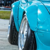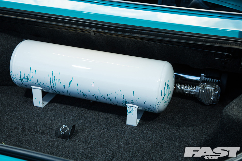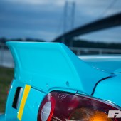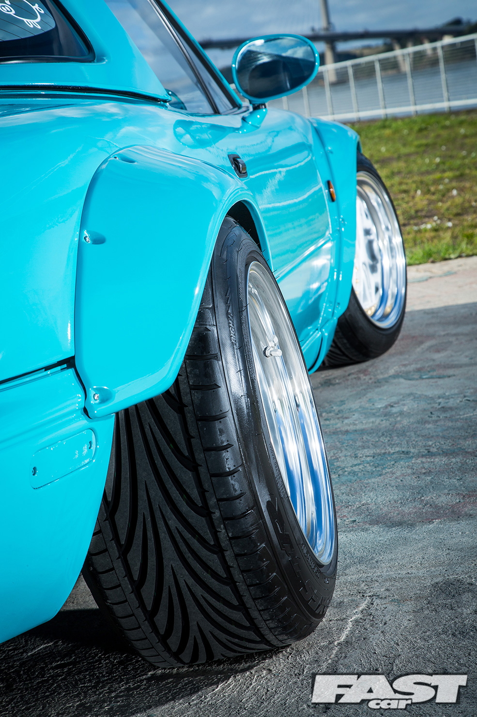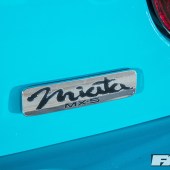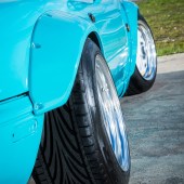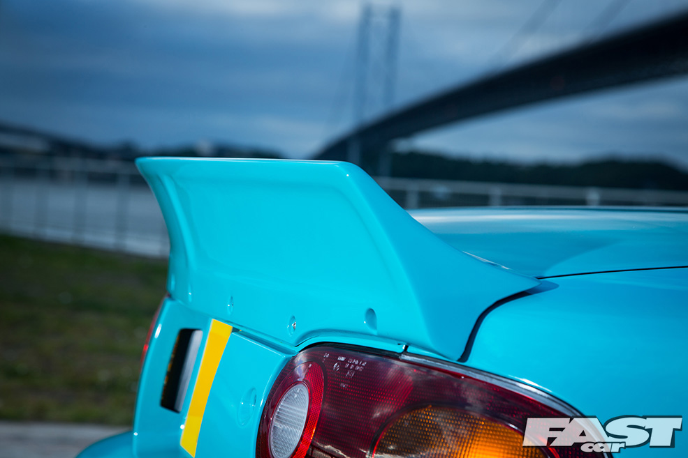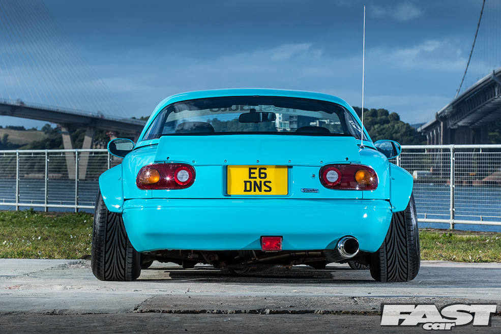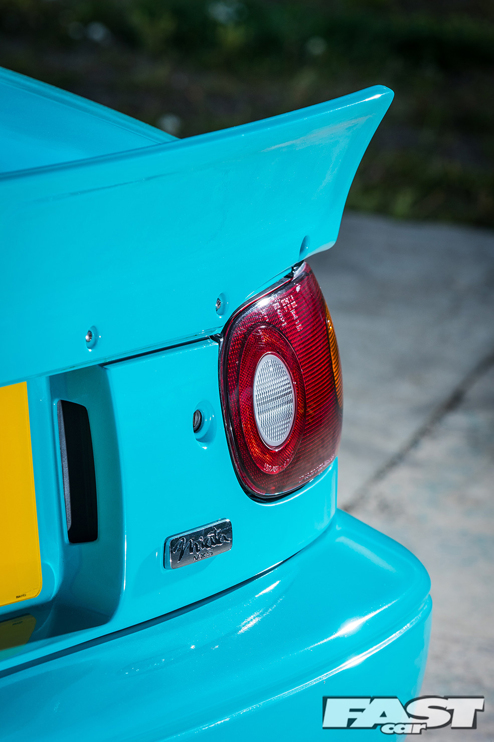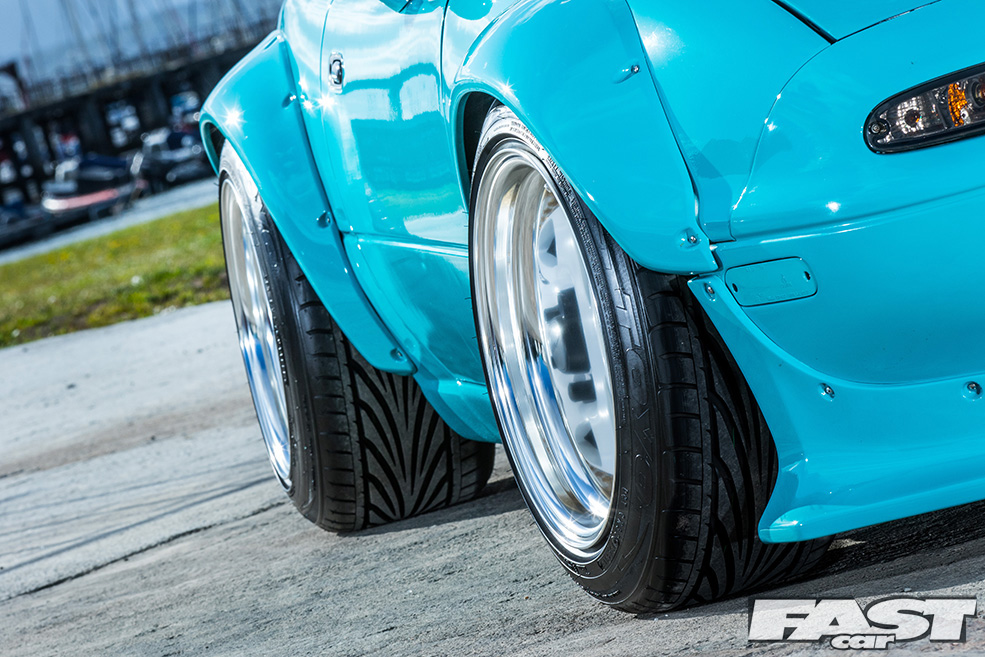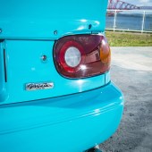 Genuine Rocket Bunny kit comprising of front lip, over-fenders and rear wing imported from TRA Kyoto by Injection Imports; full respray in turquoise; colour-coded front and rear reflectors; front bumper smoothed; de-chromed handles, badge and Frankenstein plates; Eunos rear panel with retro-fi t LED registration lights; upgraded 7in LED headlights; smoked clear side lights; front arches modified for extended steering clearance by J Fab; US imported ‘Miata MX-5’ badge; OEM non-boot rack boot lid.