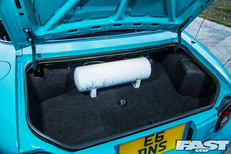 As usual, there was no rash decision and instead a thorough search found the ideal option in AirREX struts. These were custom made for the MX-5 and arrived from the Netherlands to be mated with Air Lift V2 management and a two-gallon AirREX tank. From here on some tinkering of suspension bits and hefty work to the arches finally achieved the desired set-up.