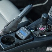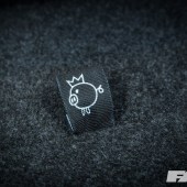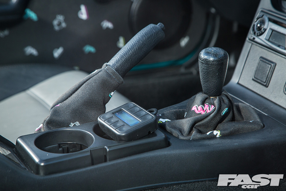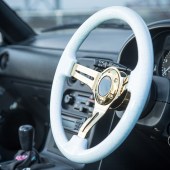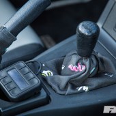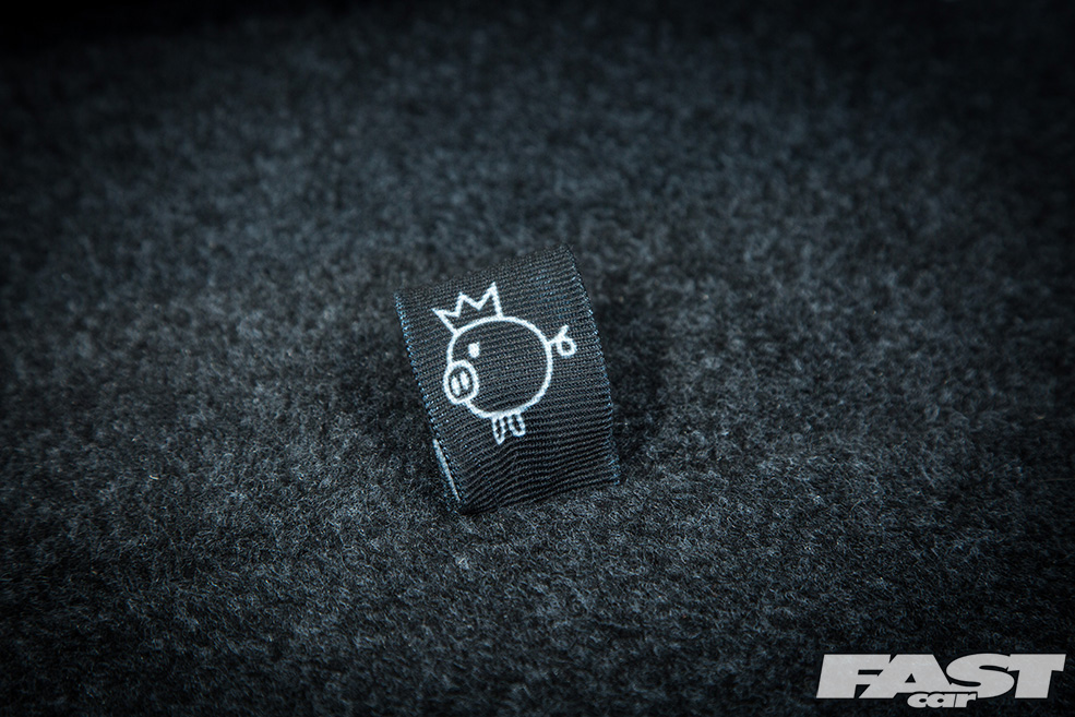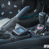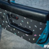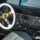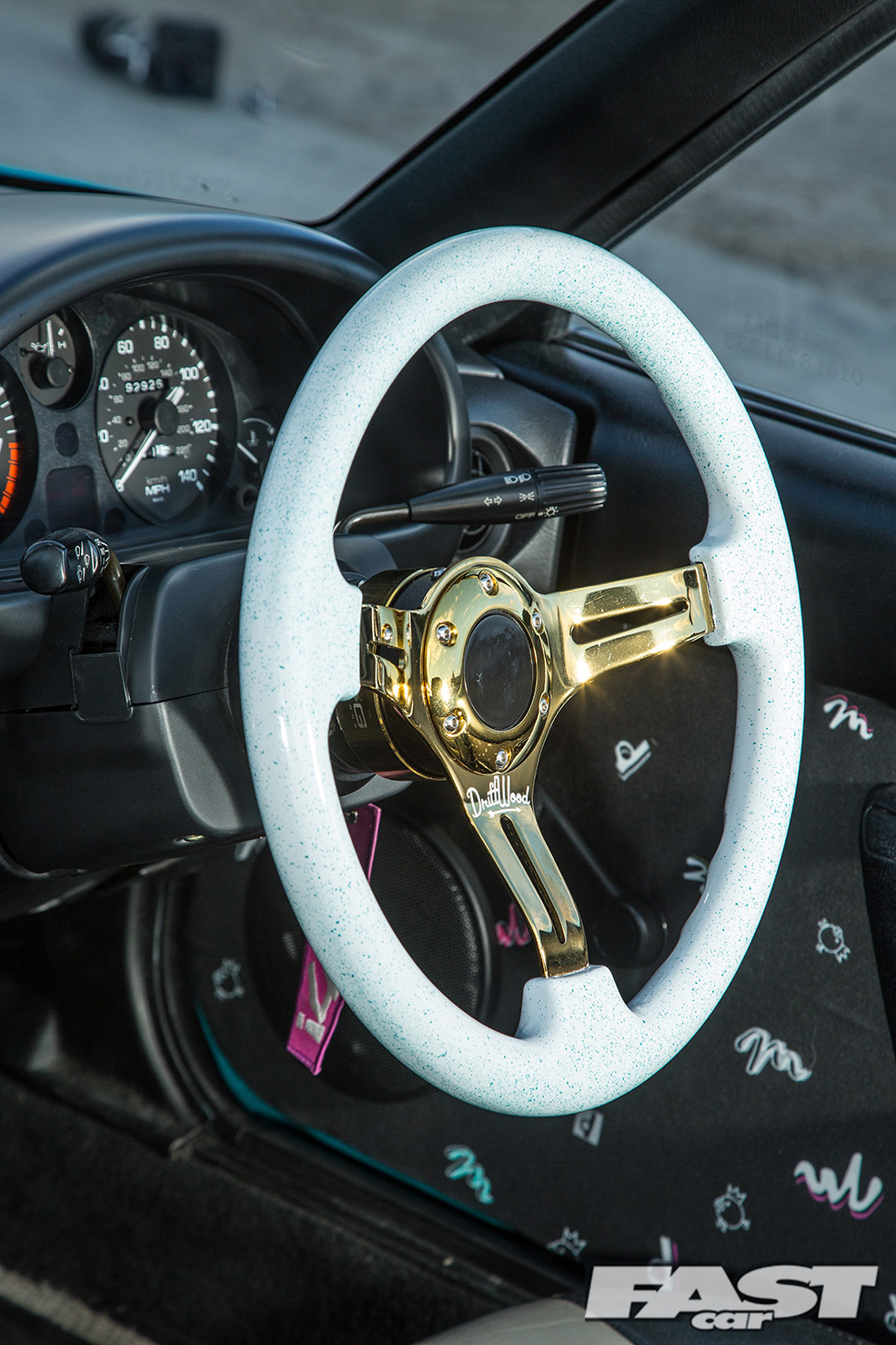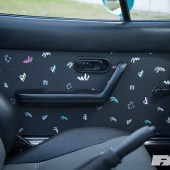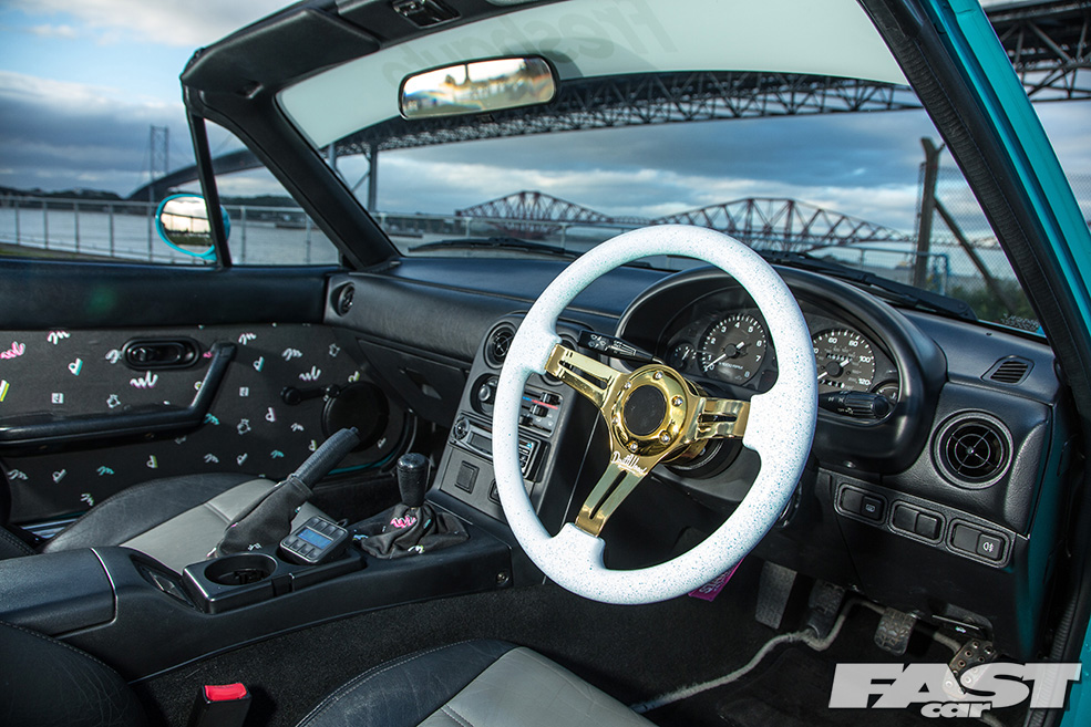 Eilidh’s attention switched to the interior and here she gave it a personal touch. With the MX-5 having hints of a retro theme, she designed a ’90s style pattern for some of the trim material. It includes symbols relevant to the car, like the ‘M’ from Miata and the Rocket Bunny ‘King Pig’ logo and you’ll find it lavished on the doorcards and gaiters. Elsewhere the Driftwood steering wheel and air tank were painted white and given a colour splash to finish them off.