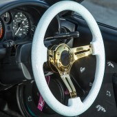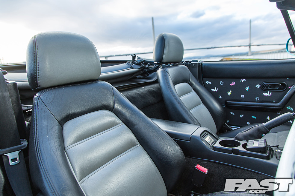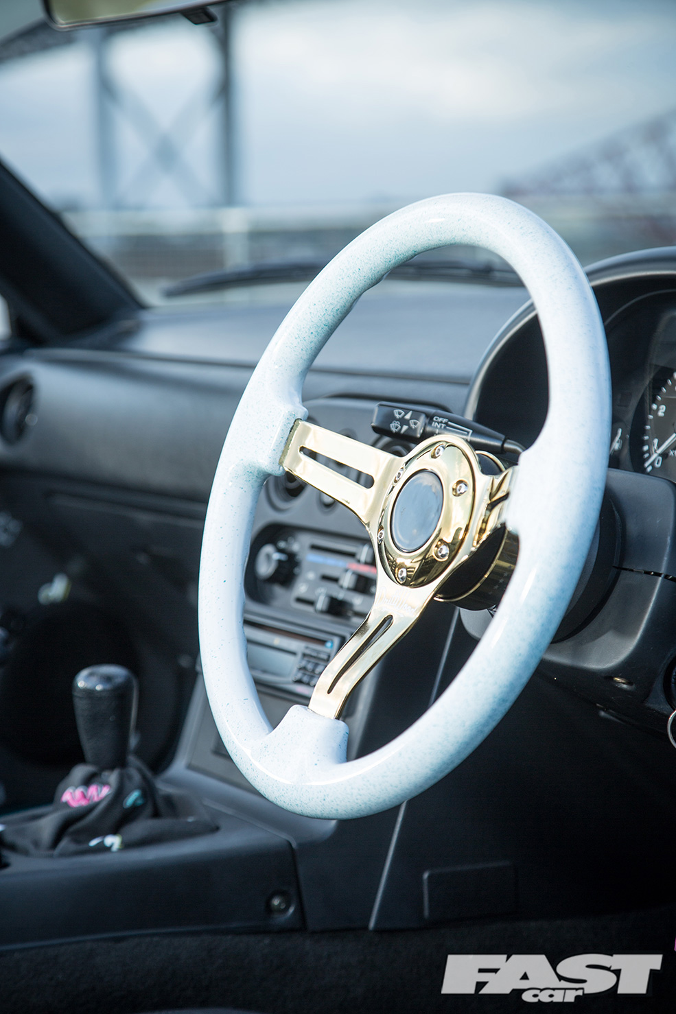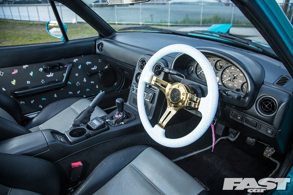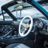 US-imported Driftwood steering wheel and custom painted; NRG Innovations short hub; NRG Innovations gen 2.0 quick release; custom-designed patterned fabric (printed on 240gsm Twill) installed on new PVC doorcards; gear and handbrake gaiters; MX-5 Parts cup holder; boot build for air suspension; Air Lift two gallon tank custom painted.