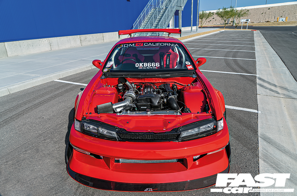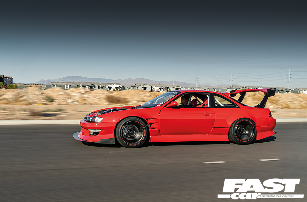 Now, this is a pretty bold way for the build to step firmly into its own personal interpretation of adulthood. You see, authenticity is a powerful tool; peeping through the window of this car today, you’ll spot that the steering wheel is indeed now on the ‘correct’ right-hand side, which is wholly at odds with the California license plates. This is a USDM 240SX that’s been reconfigured back to JDM layout, and it takes a huge amount of work to do this; it’s not just a case of swapping in a new dash, you’ve got to get down and dirty with linkages and columns and pedals and all sorts, but the kudos points among the aficionados make it all more than worthwhile. Driving a right-hand drive Japanese car in the USA carries a lot of respect: everyone knows you’ve had to put the graft in, and get it inspected and blue-tagged by the authorities to prove it’s legit. The quality of work here really is outstanding too, there are no squeaks or rattles or whiffs of adhesive like you find in a lot of backstreet lash-ups, Omar’s modified S14A Silvia sports OEM-like levels of fit-and-finish.