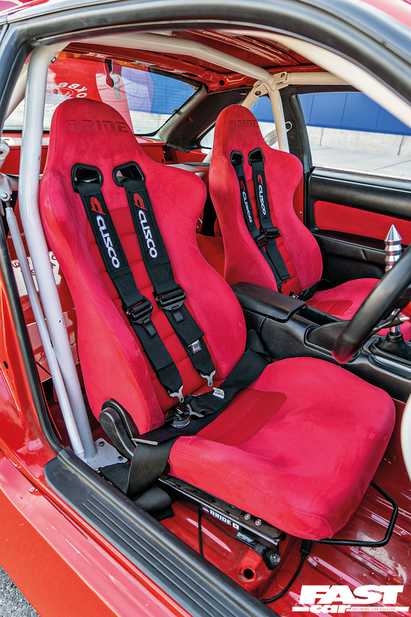 Right-hand drive conversion, fully stripped, Cusco 6-point rollcage, Bride Euroster II seats, Cusco harnesses, Cusco drift button, Bride seat rails, NRG harness bar, NRG steering wheel hub with quick-release, Personal steering wheel, LRB Speed rear seat delete, Tamale boost, AFR and water temp gauges