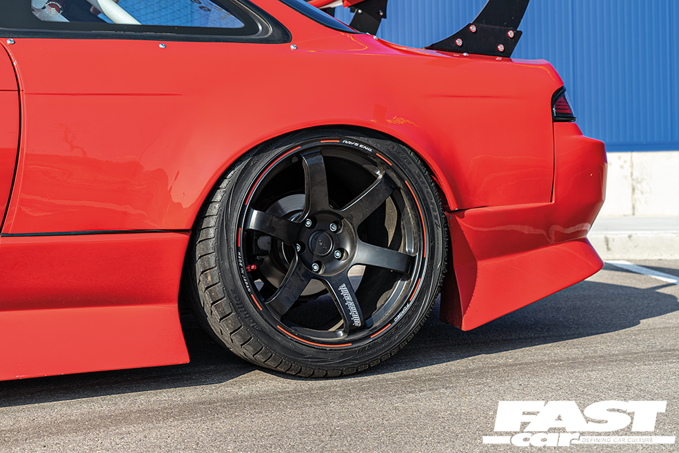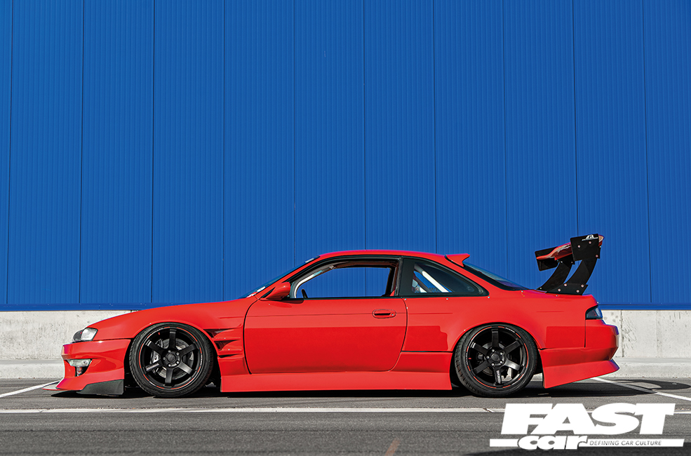 As you might imagine, the car was wowing the populace and scooping all manner of silverware by this point. A fitting way for the project to reach the conclusion of its lifecycle and slip into retirement, yes? Ah, well, no actually – because unlike us mere mortals, this S14 has further phases of evolution to play out. Omar was far from done with the build, he’s always having new ideas and there’s always a fresh idea bubbling away. And so we reach phase five, the ethereal afterlife evolution: “I ended up chroming the RB26, getting new WORK Meister wheels, installing air-ride, fitting the wide-body kit, and adding the big wing,” he grins, nonchalantly reeling off a fairly incredible list of upgrades that’d be a life’s work for some people. Omar just doesn’t know when to stop, his approach to success is half-rollercoaster, half-steamroller. Full on to the max.