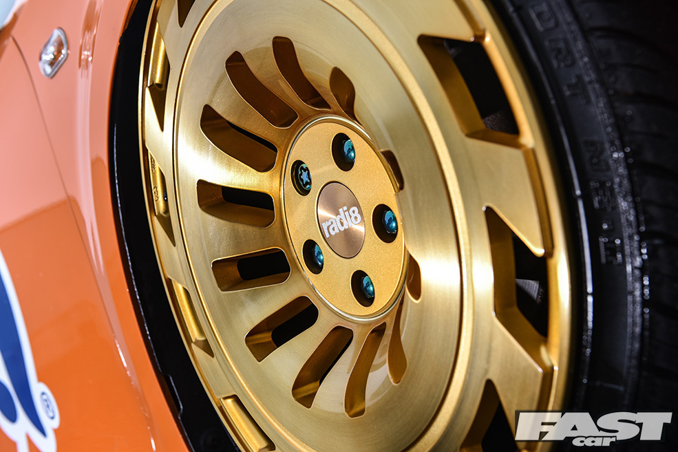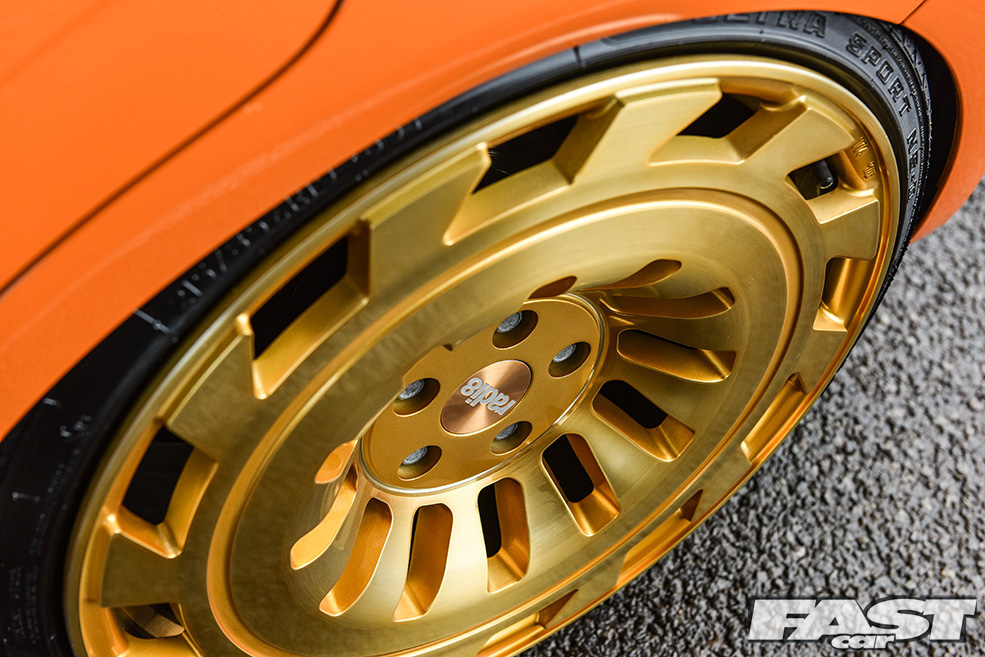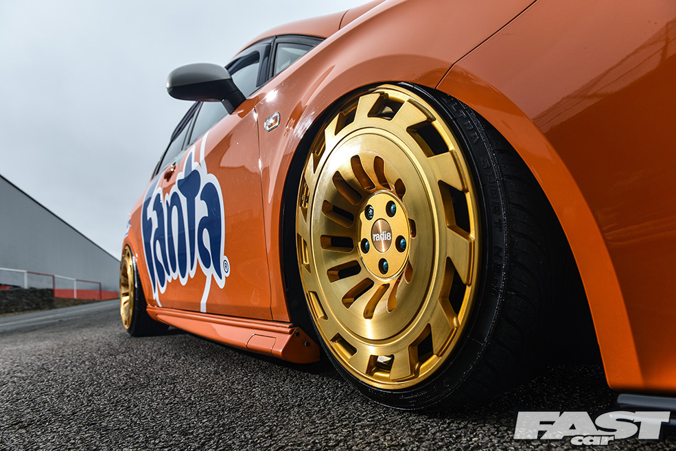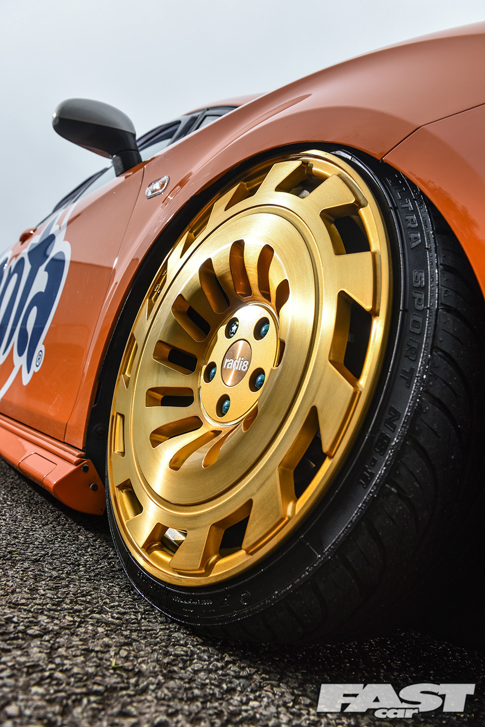James settled on some seriously funky Radi8 turbofan-style rims set off in a brushed gold tone to prop up each corner once the Fanta livery was fitted – a bold choice that only makes the whole thing stick in your head that little bit longer! These are shod in sticky Nankang rubber which helps to transmit the power from that lightly breathed-on oil burning motor up front.
