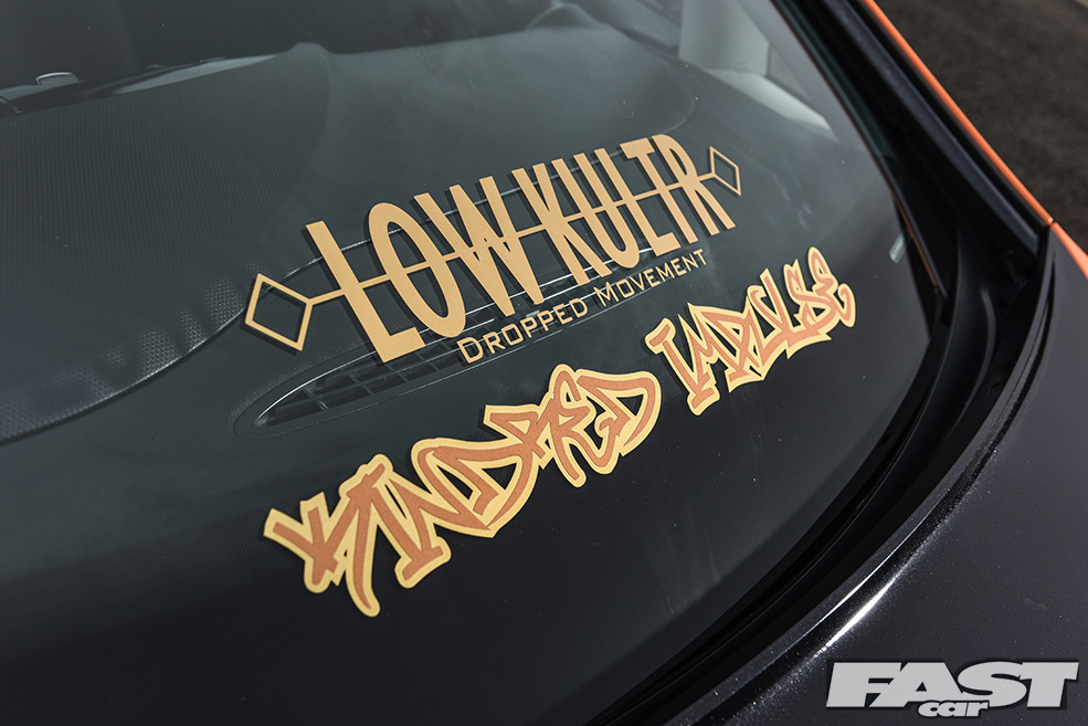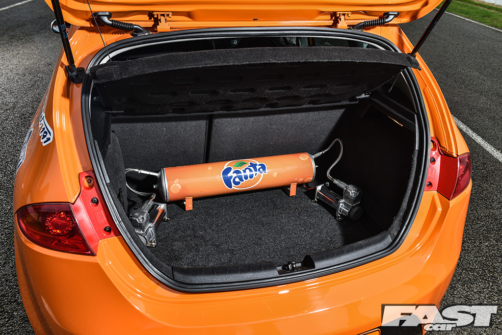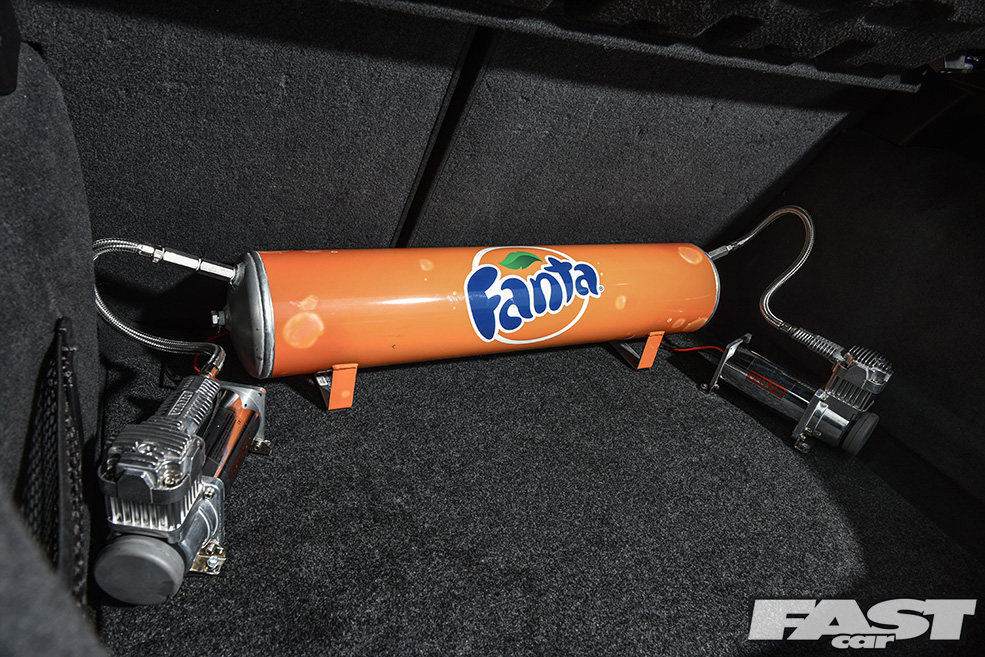 “When we were fitting the suspension I wanted to wrap the air tank in a certain style,” he remembers, keen to utilise the materials and knowledge that he possessed from his day job once more. “I was going to go with the Irn-Bru logos but I didn’t really like the drink, so I settled on Fanta, with a designer at work making mock-ups of the logo on the side of the car at the same time.”