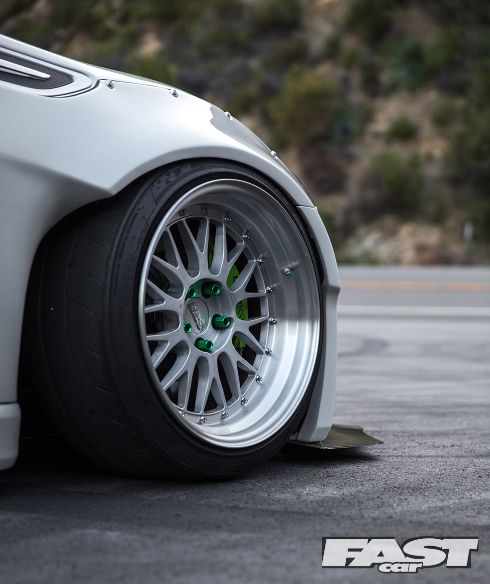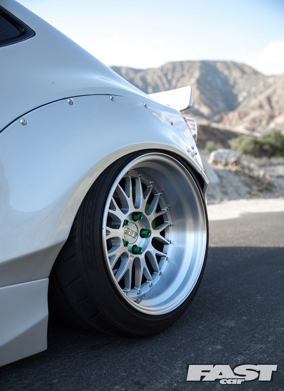 With the various jigsaw puzzle of wide-body parts hastily bought and sat up in Freddy’s living room, it was only then that he realised there was a lot more to adding a Rocket Bunny kit than just sticking on some wider panels. “The kit sat there for six months while I worked out what wheels and colour scheme to go with…” he says. While Rocket Bunny itself opts for Work wheels on its demo cars, Freddy chose some with a European flavour in the form of four clinically clean BBS LM split rims; a whole 12.5-inches wide at the back and shod with premium race rubber.