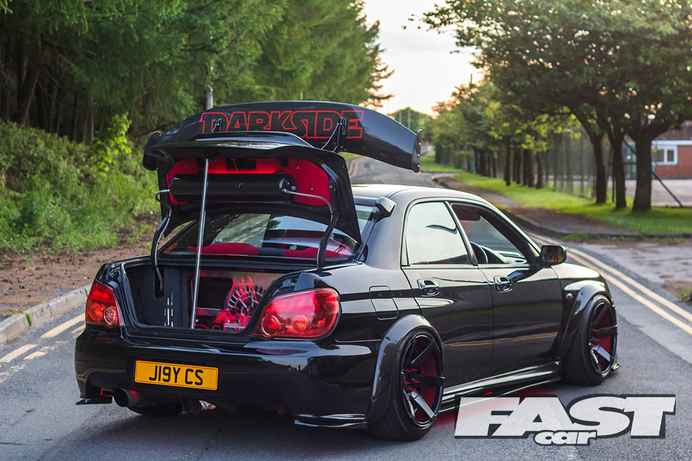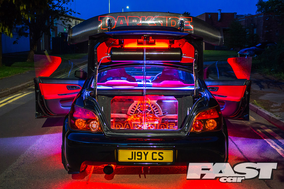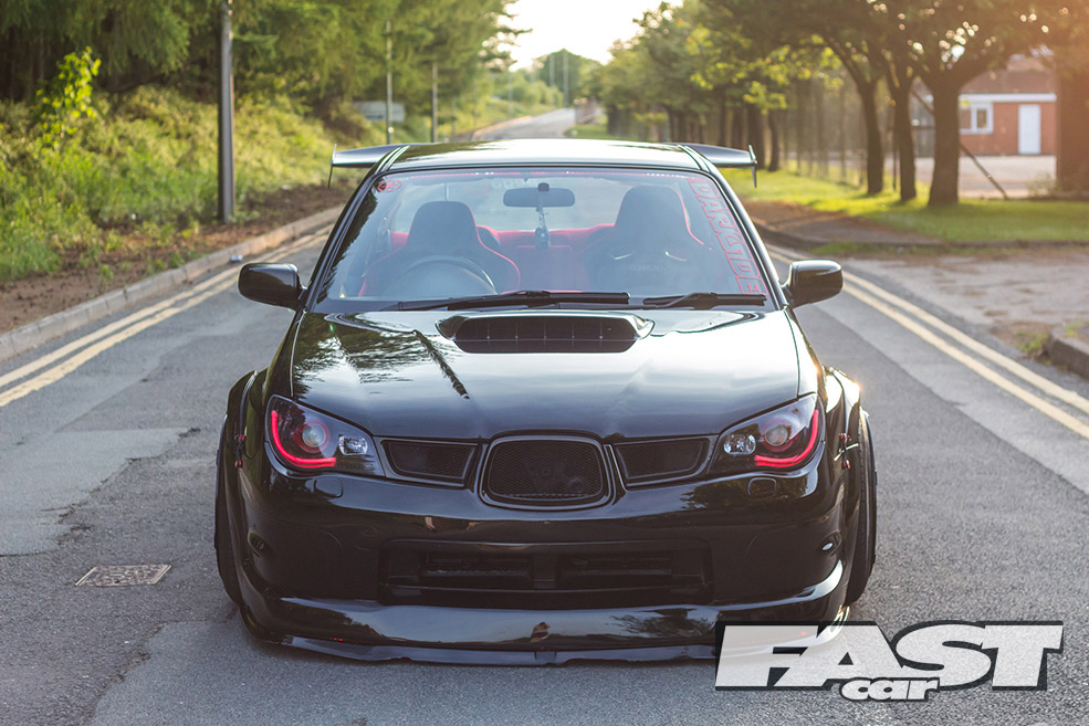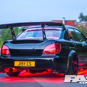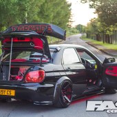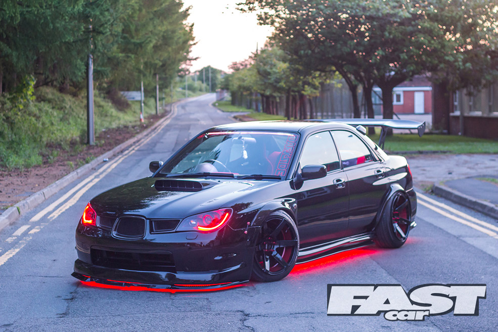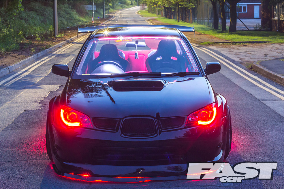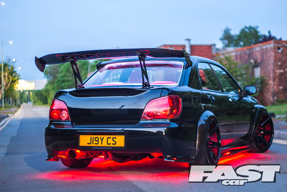 2006 WRX; custom front bumper with carbon-fibre detailing; carbon-fibre Chargespeed splitter; carbon- fibre wing mirrors; scoop; lower lip kit and canards; custom rear bumper; carbon-fibre Karlton arches; Japspeed carbon-fibre rear wing; Do-Luck ducktail bootlid; full red neon detail including under car, headlights and interior.