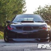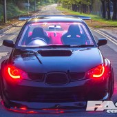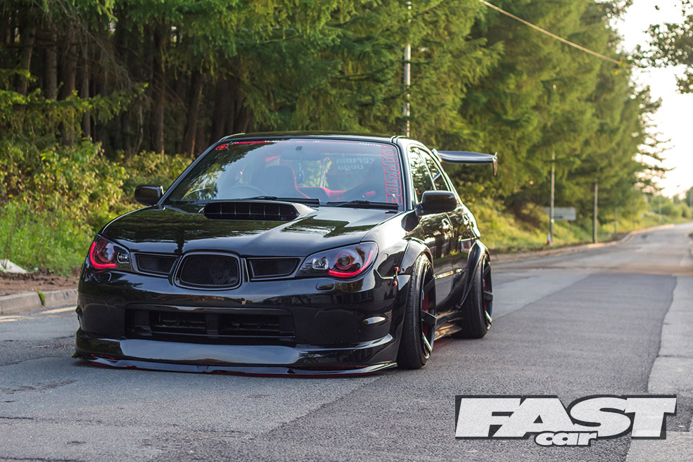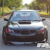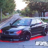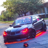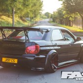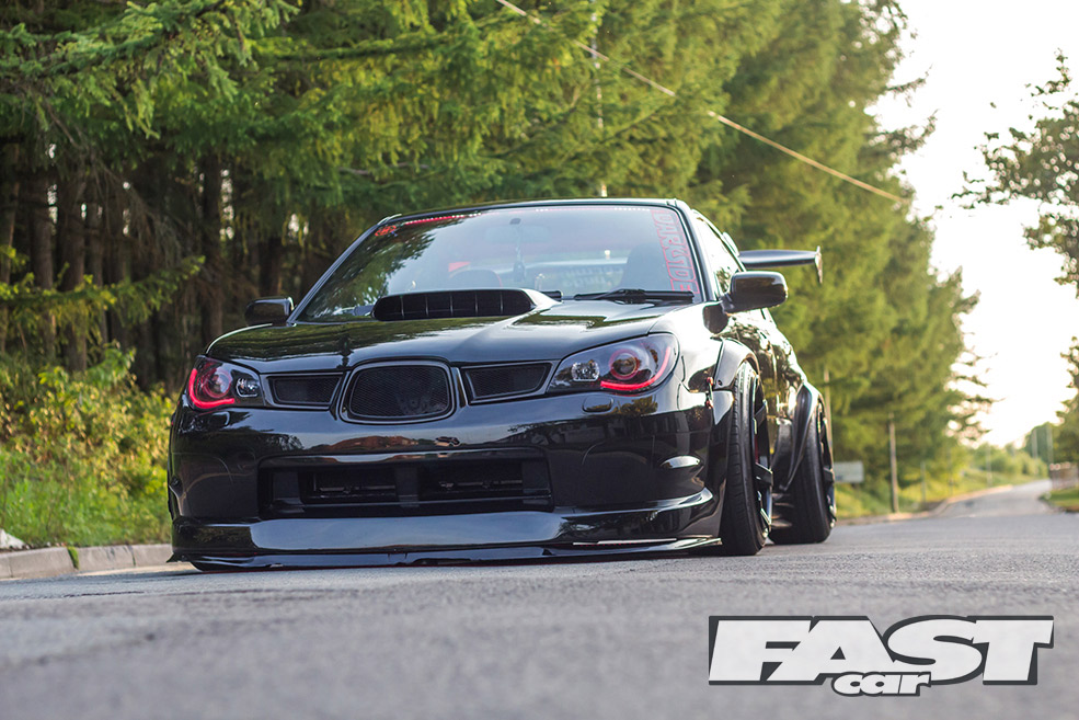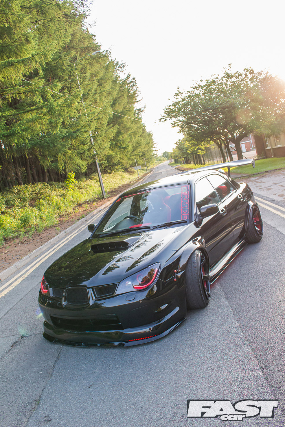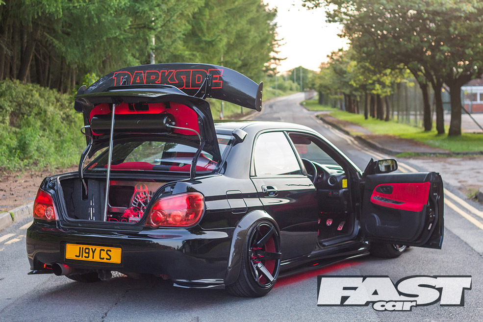 2006 WRX; custom front bumper with carbon-fibre detailing; carbon-fibre Chargespeed splitter; carbon- fibre wing mirrors; scoop; lower lip kit and canards; custom rear bumper; carbon-fibre Karlton arches; Japspeed carbon-fibre rear wing; Do-Luck ducktail bootlid; full red neon detail including under car, headlights and interior.