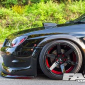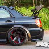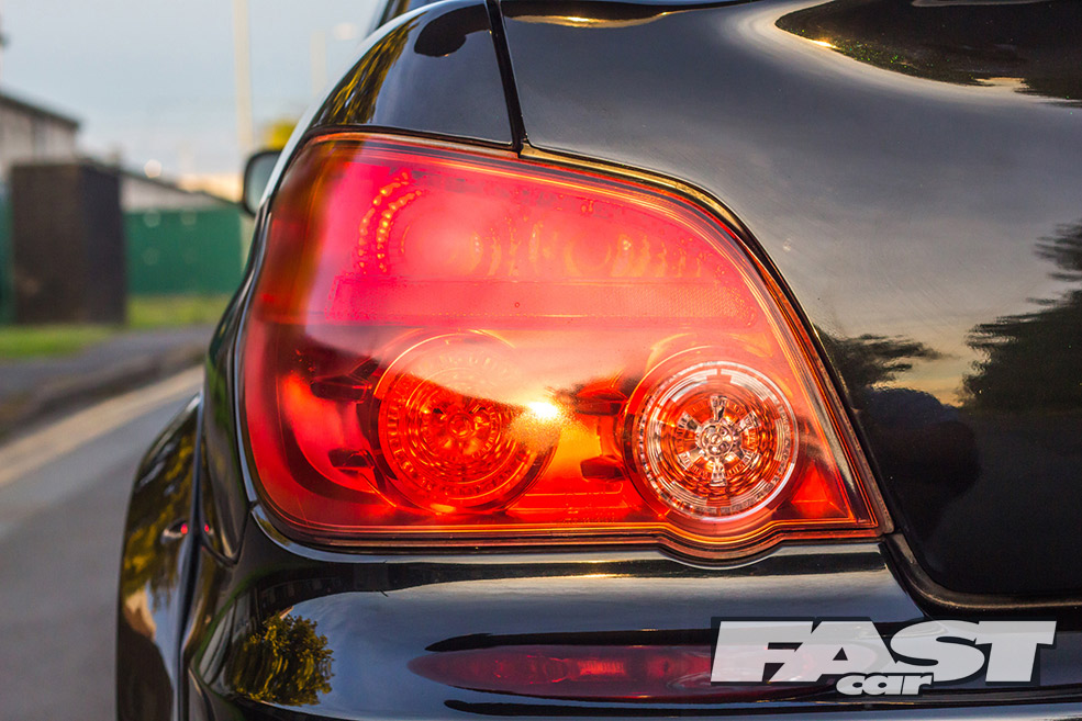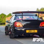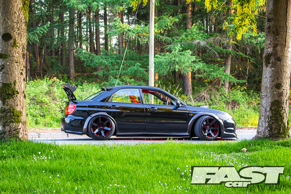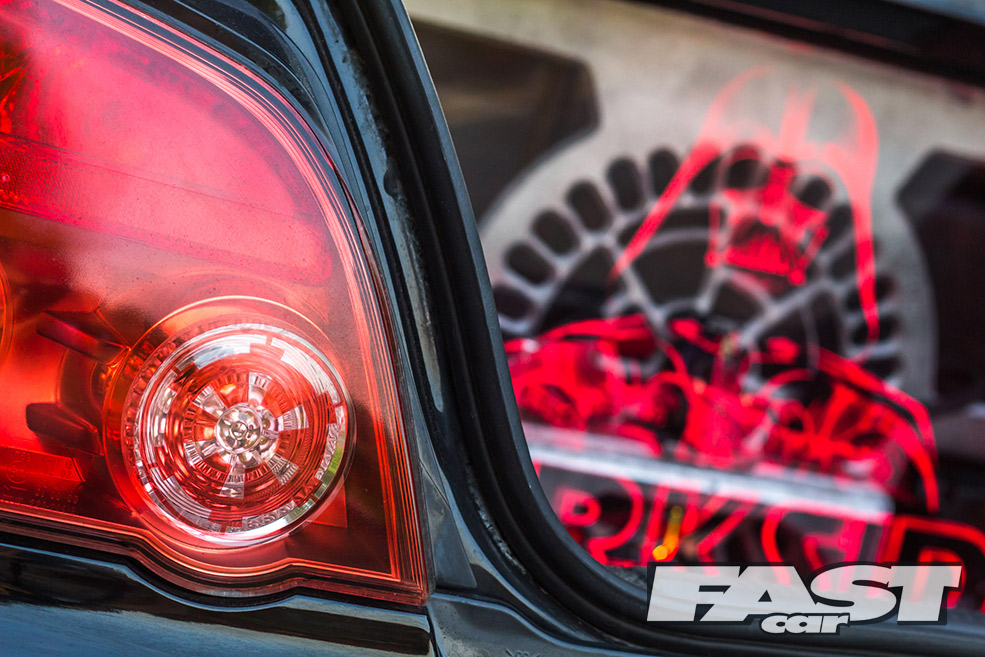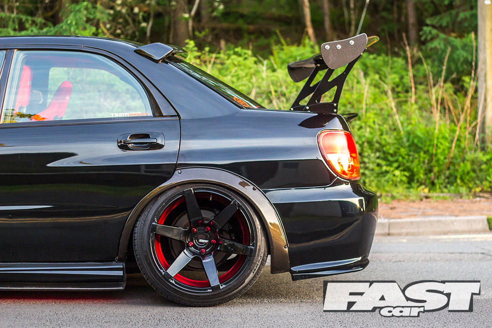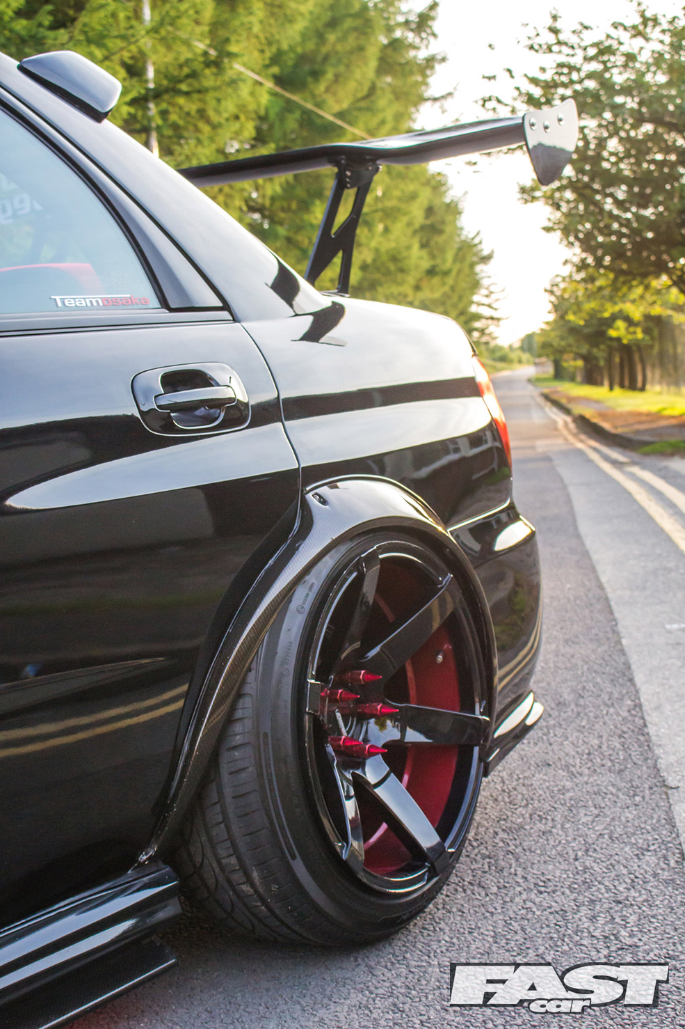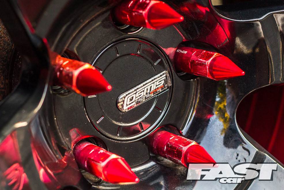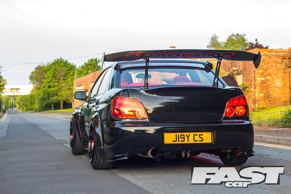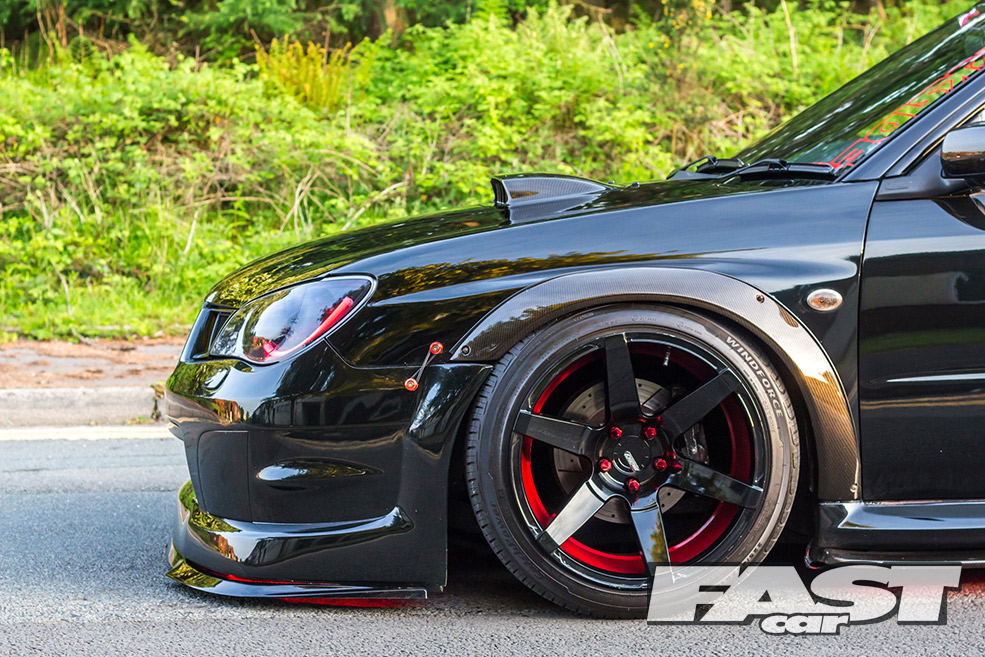 Now, if you’re into your Subarus, you’ll probably know about Karlton arch flares. If not, er… you’re looking at ’em. “I planned on getting the Karlton flares from the start,” says Jay. “And I knew they’d have to be sitting over wide concave rims – I didn’t want dish. I also knew that the spoiler was going to come off straight away, and I quickly started the hunt for the lip kit and – more importantly – the wheels. I had my eye on some WCI rims, but after looking on Driftworks one night I came across Cosmis Wheels, and when I saw the extreme offset and concave nature of the S1, I had to have them. And it had to be nothing less than the mental 10.5-inch-wide ones! This meant I had to get 15mm adaptors from the States.”