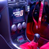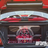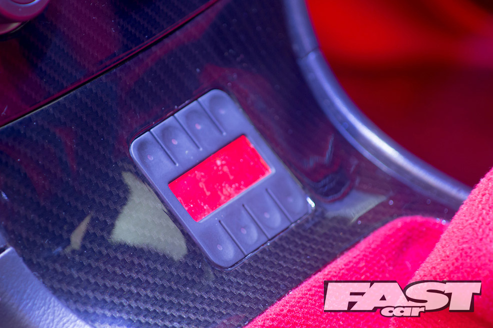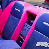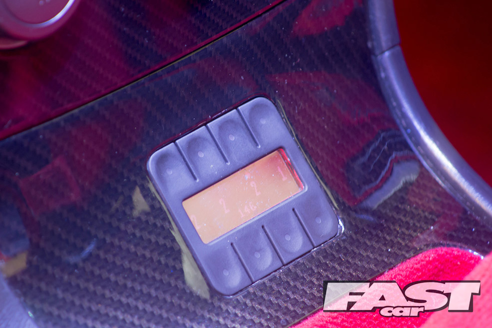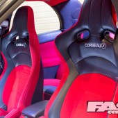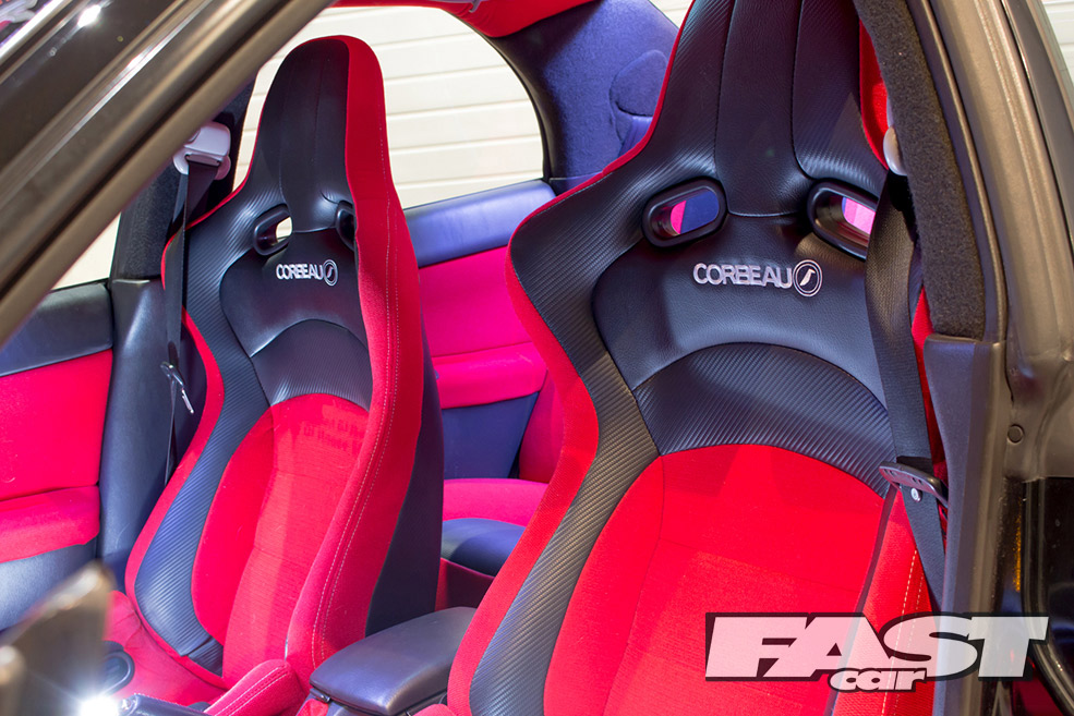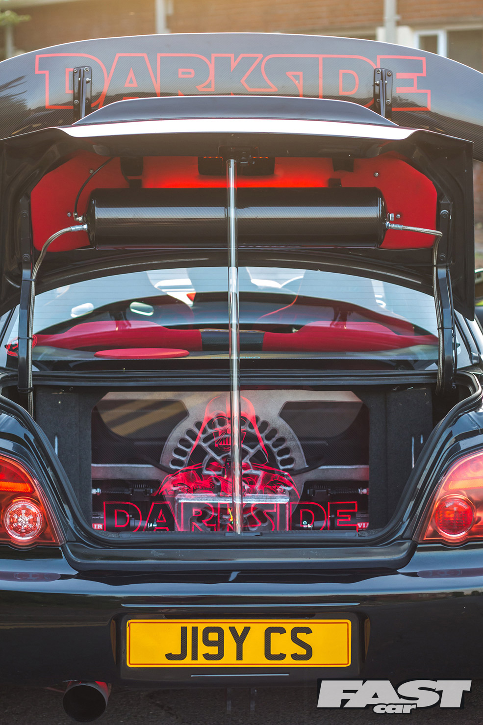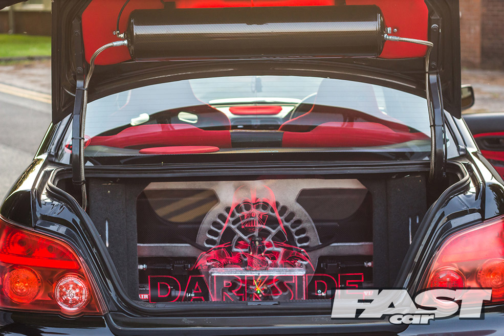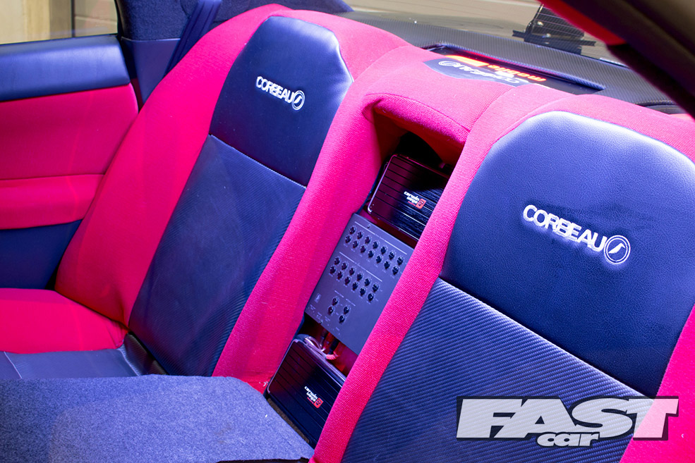 It wasn’t all about exterior menace, of course. The interior is where you spend your time, so Jay didn’t scrimp here either. The custom front Corbeaus set the tone for the insides, with their Red Jacquard fabric and carbon-fibre effect vinyl detail, and everything else inside just had to be trimmed to match. It’s a visual riot in there.