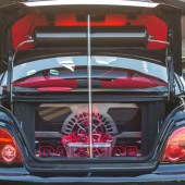 Corbeau reclining bucket seats trimmed in Red Jacquard fabric and carbon-fibre effect vinyl detail; back seats trimmed to match along with doorcards; gaiters; custom rear parcel shelf and headlining; custom iPad install in dash (designed to look OEM); carbon-fibre dash detail; custom Cerwin Vega audio install including 8in subwoofer; parametric equaliser direct from iPad into Cerwin Vega mini amplifiers hidden in rear armrest.