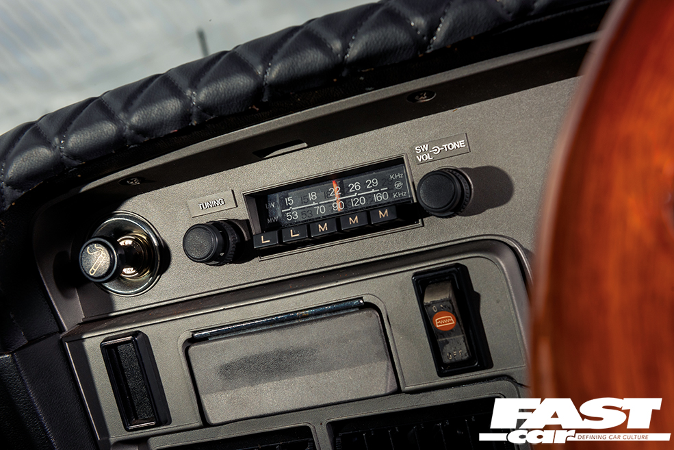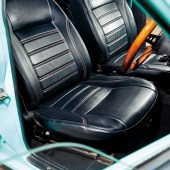OEM dash retrimmed in period correct vinyl with diamond stitch, new silent coat sound proofing, underlay and new carpe, seats, door cards and headlining all retrimmed in vinyl, custom OEM-style parcel shelf, Grip Royal mahogany steering wheel and HKB boss, fire extinguisher, aftermarket gear knob, centre console removed.