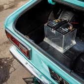 Fully resprayed in Tiffany blue, widened metal arches smoothed into body, custom metal chin spoiler, custom metal rear duck tail spoiler, new old stock front grille, chrome wind deflectors, chrome trim on bonnet, chrome bumpers front and back, chrome bullet wing mirrors, colour coded side vents, chrome headlight bezels, chrome door handles