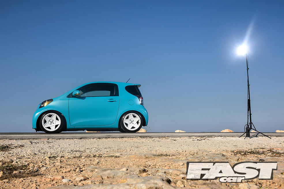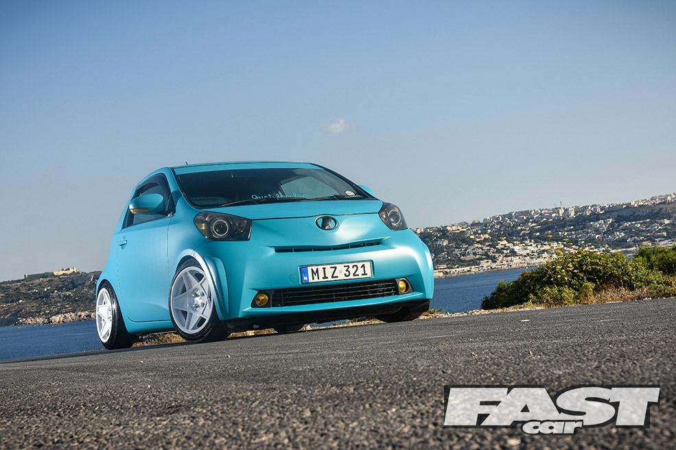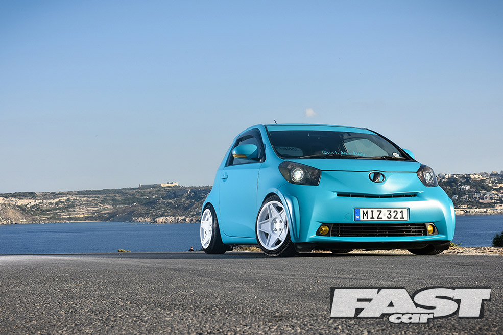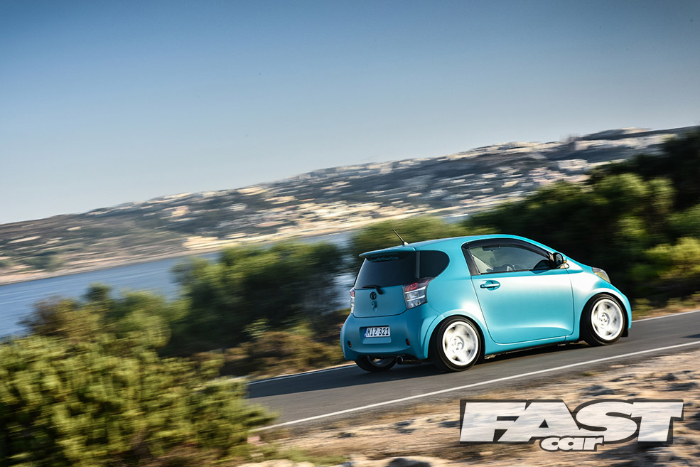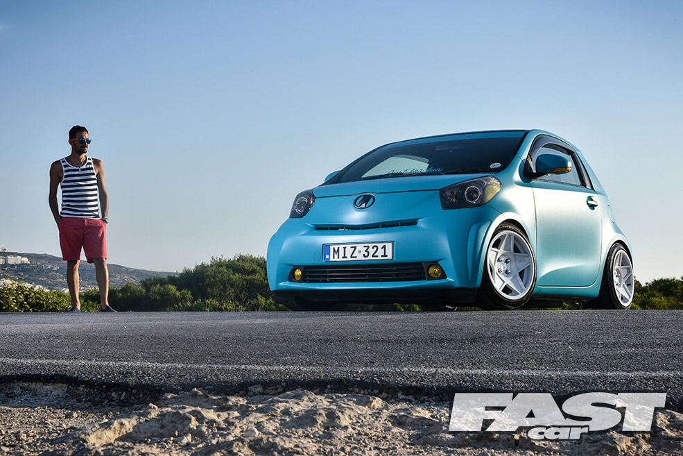 The IQ isn’t as slow as most people imagine either. Considering they weigh as much as a can of sugar free Red Bull, the 1-litre has nearly 70bhp. There’s a 1.33 VVT-i version with 97bhp too – and that’s a bit like putting a stick of dynamite in a food blender. The most important thing though is the way they’re styled, the IQ is actually proportioned to resemble a real car, albeit the sort you draw as a toddler and your dad sticks on the fridge. It also screams fun – you’ve got to be a pretty depressed individual not to raise a smile when you see one of these tooling past. And that’s what Carden Mizzi’s Toyota is all about.