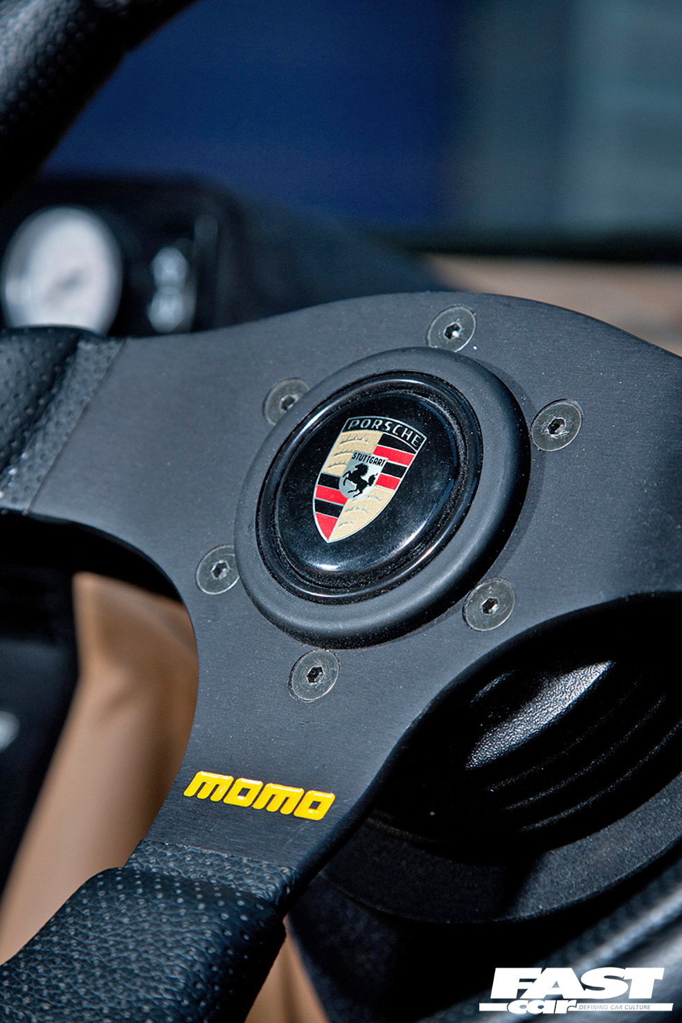 Smoothed dashboard (speedo removed) seats and door cards trimmed in heritage tan leather, all interior plastics flocked in black, custom-trimmed Magic Tree, Momo 280 steering wheel with Porsche centre, custom suede-trimmed roof lining, custom air-ride pod gauges and switches located in original console.