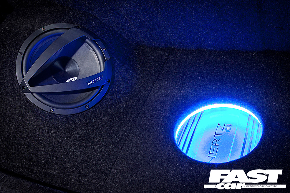 Alpine D106 7in motorised dash monitor, Hertz 5.25in co-axials, Hertz 10in subwoofer, Hertz 4-channel amp, custom boot build trimmed in black carpet, amplifier back lit with blue lighting, iPod integration, air compressor in boot floor, car dials relocated to glovebox and on show on screen via camera.