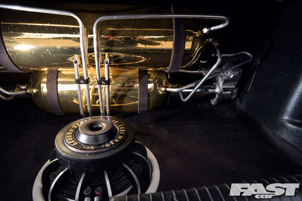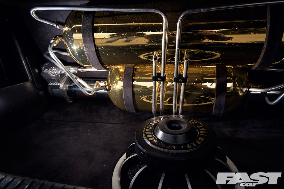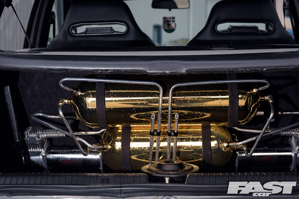 8x16in (front) and 9.5x16in (rear) Image HT 3-piece split rims (rebuilt with painted gold barrels and Volvo Dark Metallic Grey centres, polished lips and gold hardware); Falken tyres; 2.0-litre Calibra brake conversion (with vented, drilled and grooved discs, EBC pads and braided brake lines); Rayvern Hydraulics custom adjustable front hydraulic struts with Firestone air bags; adjustable Gaz rear shocks with Firestone air bags; AccuAir SwitchSpeed management and VU4 4-corner solenoid valve unit; 3/8in air lines throughout; Zaetech wireless iPhone control; custom boot build (with retrimmed false floor, twin Speciality Suspension seamless aluminium air tanks, compressors and custom aluminium hardlines); fully polybushed beam, roll bar and lower arms; custom machined steering knuckles to house Audi 90 wheel bearings; Calibra hubs and M-Tech driveshafts.