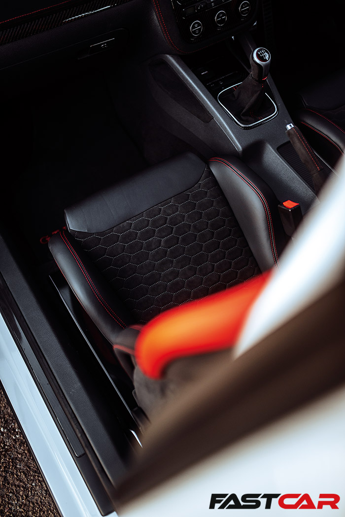 The result has a hint of Clubsport spec, with hexagonally textured alcantara centres bordered by red-accented and re-stitched leather bolsters to match the grille and pinstriping outside. Aftermarket add-ons of 2019 have disappeared, too, replaced by OEM+ enhancements such as the Mk6 GTI gear knob and Mk7 steering wheel. That McEwan Customs roll cage is bespoke and raises the rear legs to offer more space for the air ride install underneath and the whole lot hangs together with a sense of factory-built continuity.