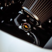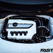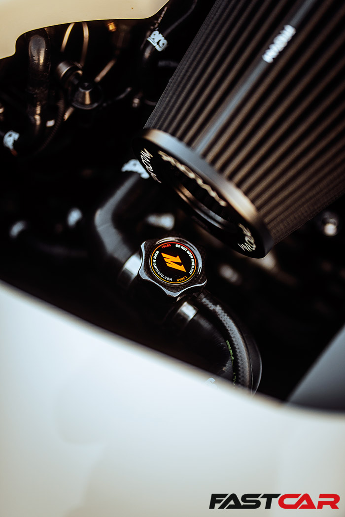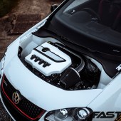 1984cc, four-cylinder, TSI turbo, RamAir oversized PRORAM air filter with custom intake, 3” downpipe, de-cat and custom exhaust system, Revo black and red engine mounts with custom polished hardware, powder-coated alternator and throttle body, Forge diverter valve, Audi R8 coil packs, shaved and smoothed engine bay with wire tuck, Forge black hose kit, new clips, bolts, wing bolts and hinge bolts, Audi TTS (8J) engine cover painted Candy White with custom metal plaque and carbon details, Porsche oil cap, Mishimoto high pressure radiator cap