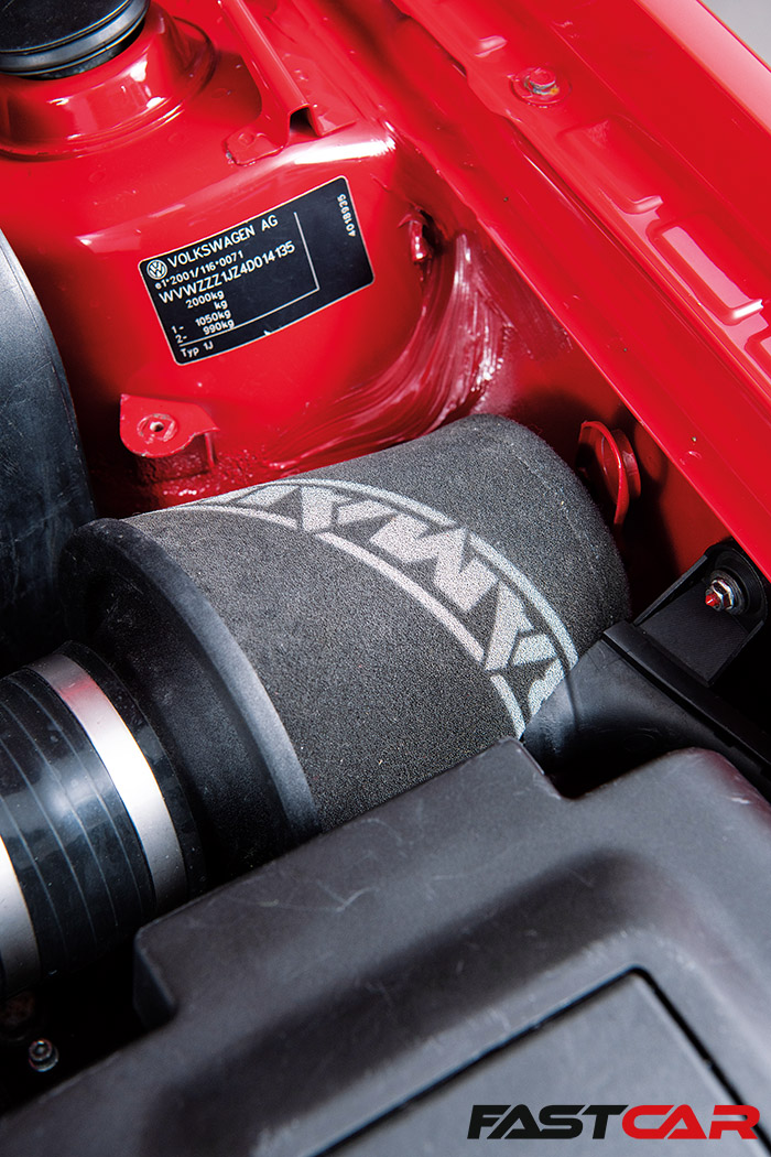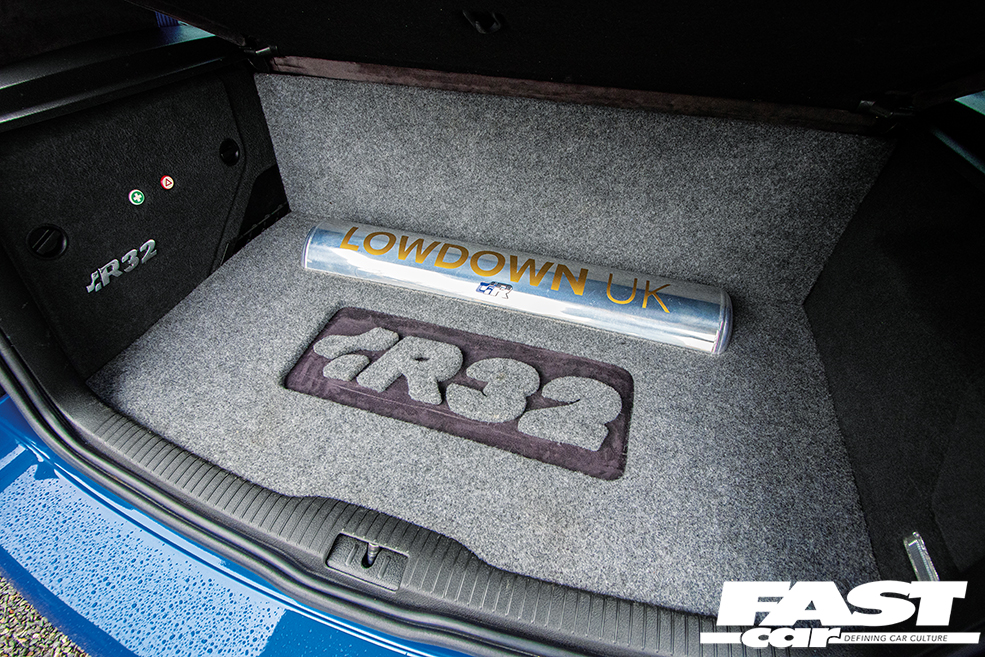Having opened the floodgates on an influx of new technology, it was important to bring the chassis up to spec too. That muscular R32 stance is enhanced by fully adjustable BC Racing coilovers and staggered spacers with a Mk5-spec 5×112 hub conversion, while a complete set of Powerflex polyurethane bushes reintroduces some welcome precision into the car’s 20-year-old suspension parts. Six-piston Porsche calipers grip 370mm RS-3 discs at the front, while the factory rear calipers have been spaced for S4-spec hardware, while the smaller JAATT Engineering brake fluid reservoir freed up more space for the wider engine.