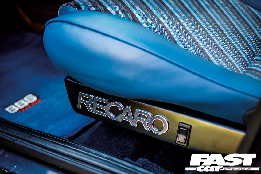 BBS four-spoke steering wheel with yellow BBS Designline cap as horn with matching Helios material insert, Premier faced cluster with yellow needles, S&P tach adapter, S&P speedo cable, BBS dash plaque, CEL dash switch, Helios material centre with custom blue outer front Recaros, Recaro imprinted side panels, matching custom blue door cards, full black recovered headliner with matching visors, blue BBS VR6 custom mats, Nothelle gas pedal with custom matching clutch & brake pedal, black c-pillars with upper trim, black sunroof surround, Euro under dash pockets, deep non ac glove box with Porsche latch, Euro upper ash tray and e-brake, BFI black leather golf ball shift knob with custom BBS Designline logo, Air Lift 3P controller on an OEM phone holder, Votex centre console, Fischer cbox cup holder, tape holder and umbrella holder with BBS umbrella, polished inner door handles, OEM first aide kit in trunk, black rear window blinds. Kenwood KRC-2560 cassette tape radio, Kenwood Excelon 5.25 speakers all around, Aktiv door speaker covers
