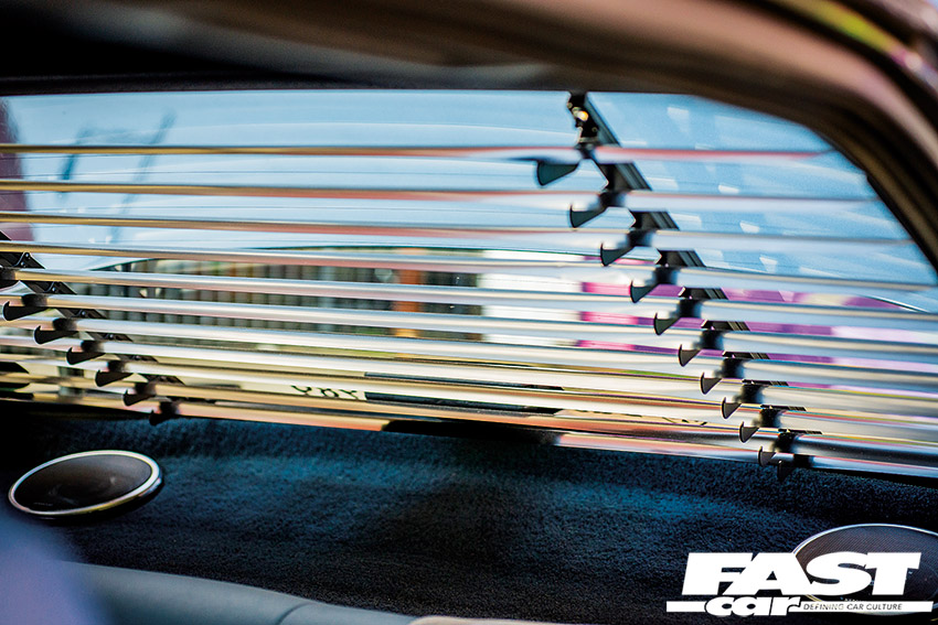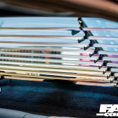 7.5×16” all around with face mounted sparkle silver centres and black powder coated wheels bolts and inner barrels. Air Lift Slam Series bags front & rear, Air Lift 3P digital air management, Air Lift 3P manifold with custom blue cover, Mk3 rear beam, polished Gruven strut cap covers, polished OMP front strut bar, chrome Eurosport rear strut bar, powder-coated sparkle silver air tank with matching Helios material cover