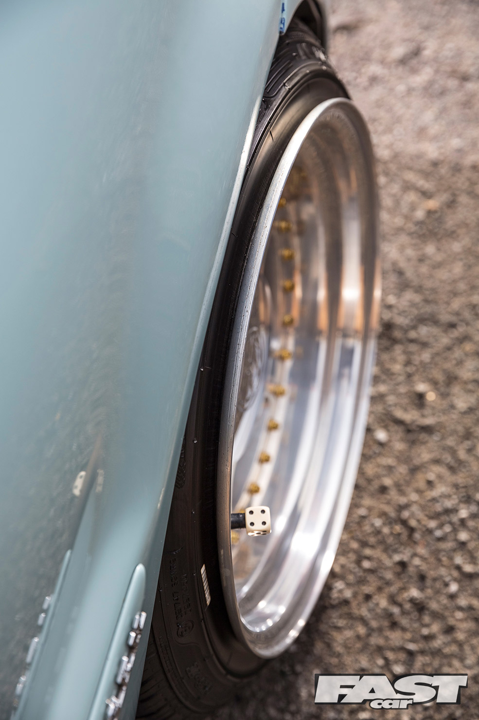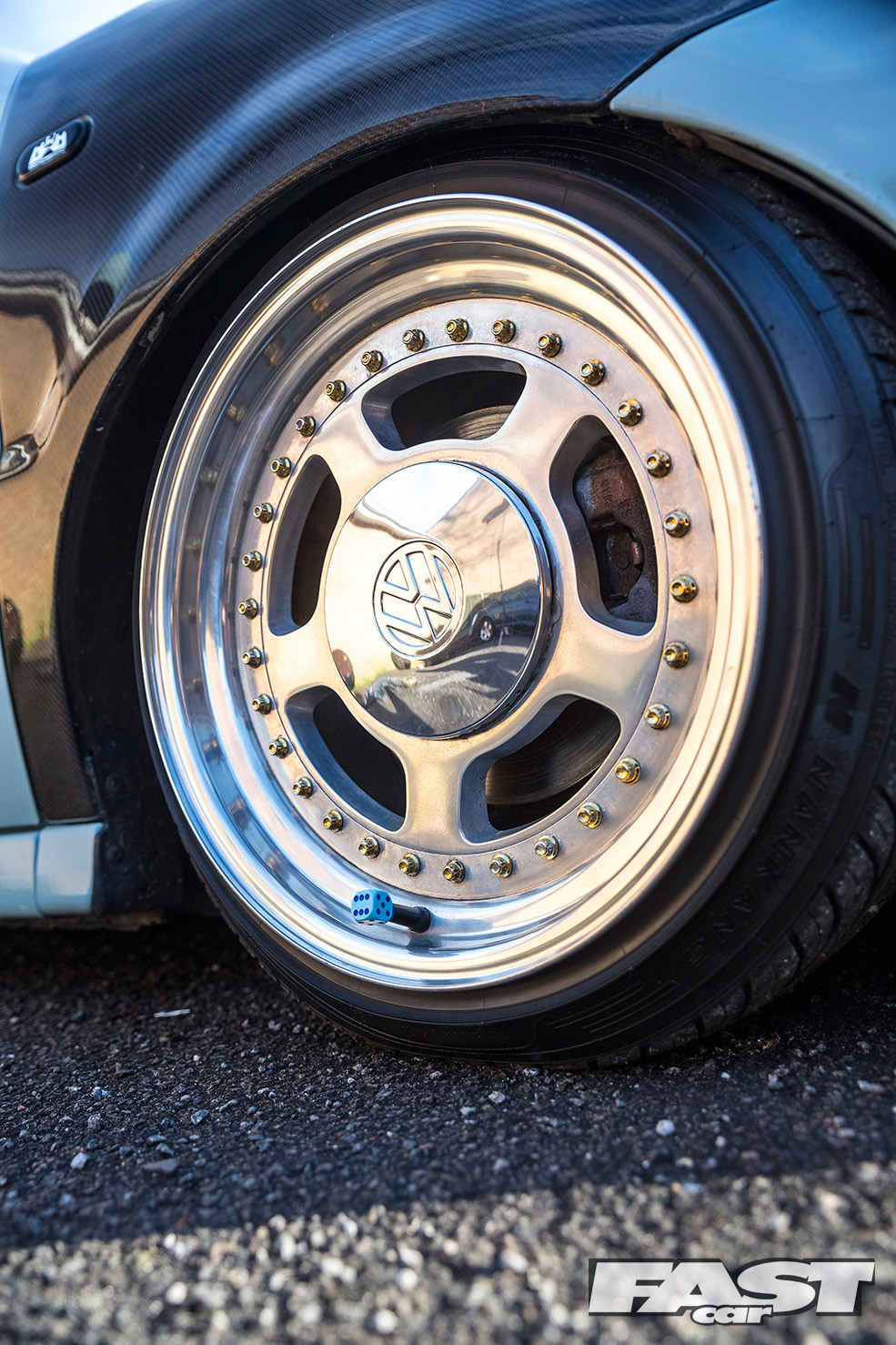 8 and 9x15inch MTi 5 wheels with gold hardware and Mk2 Golf Chrome centre caps, 165/45×15 and 185/50×15 Nankang tyres, Gaz struts, 2-way manual air ride system, VIAIR compressor and stubby tank.