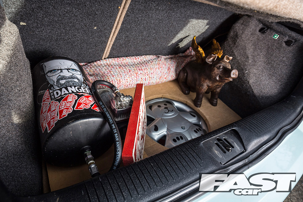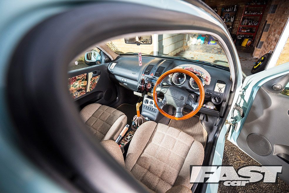 Initially though the modifying took more of a conventional approach than we see here today. Born out of competing with his older brother’s collection of Saxos and RS Turbos, the first incarnation was every bit as Euro-style as you’d expect from someone simply following the latest trend. It’s only the fact that Jon was disappointed with the way it slotted discreetly into the scene that shaped the way it looks today. After spending a not insignificant amount of cash on coilovers, paint and Colour Concept seats he almost inevitably found himself pulling up next to a near-identical Polo at a show and that’s when he thought, “what’s the point in copying? I might as well do it my way.” Only then did things go bonkers.