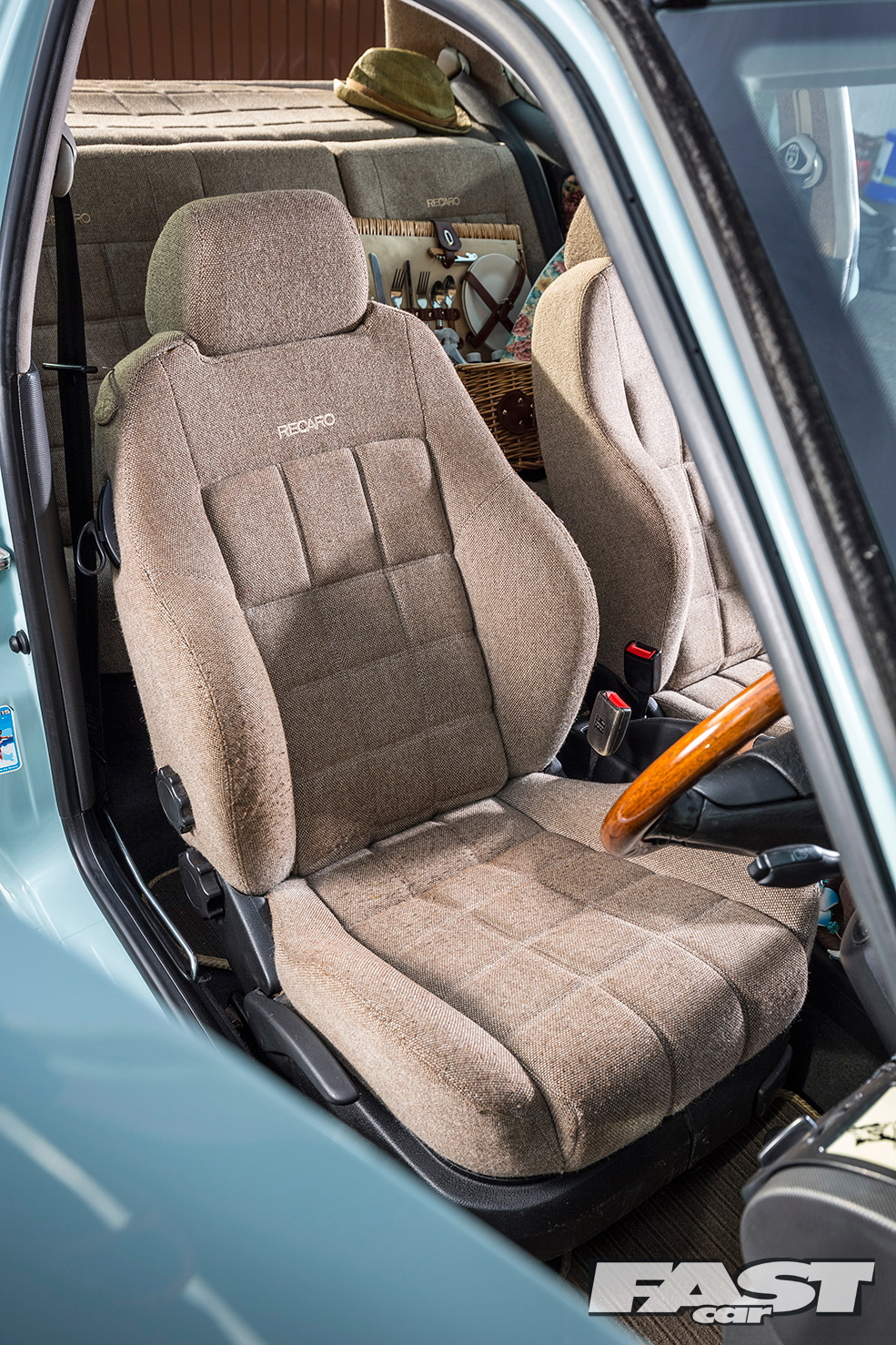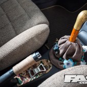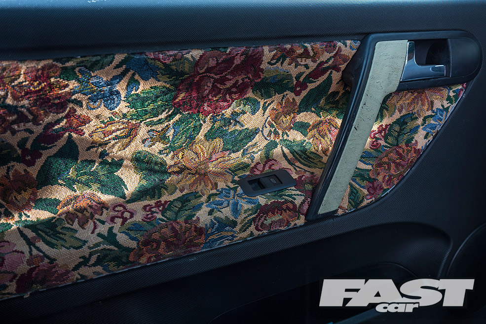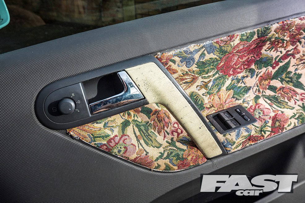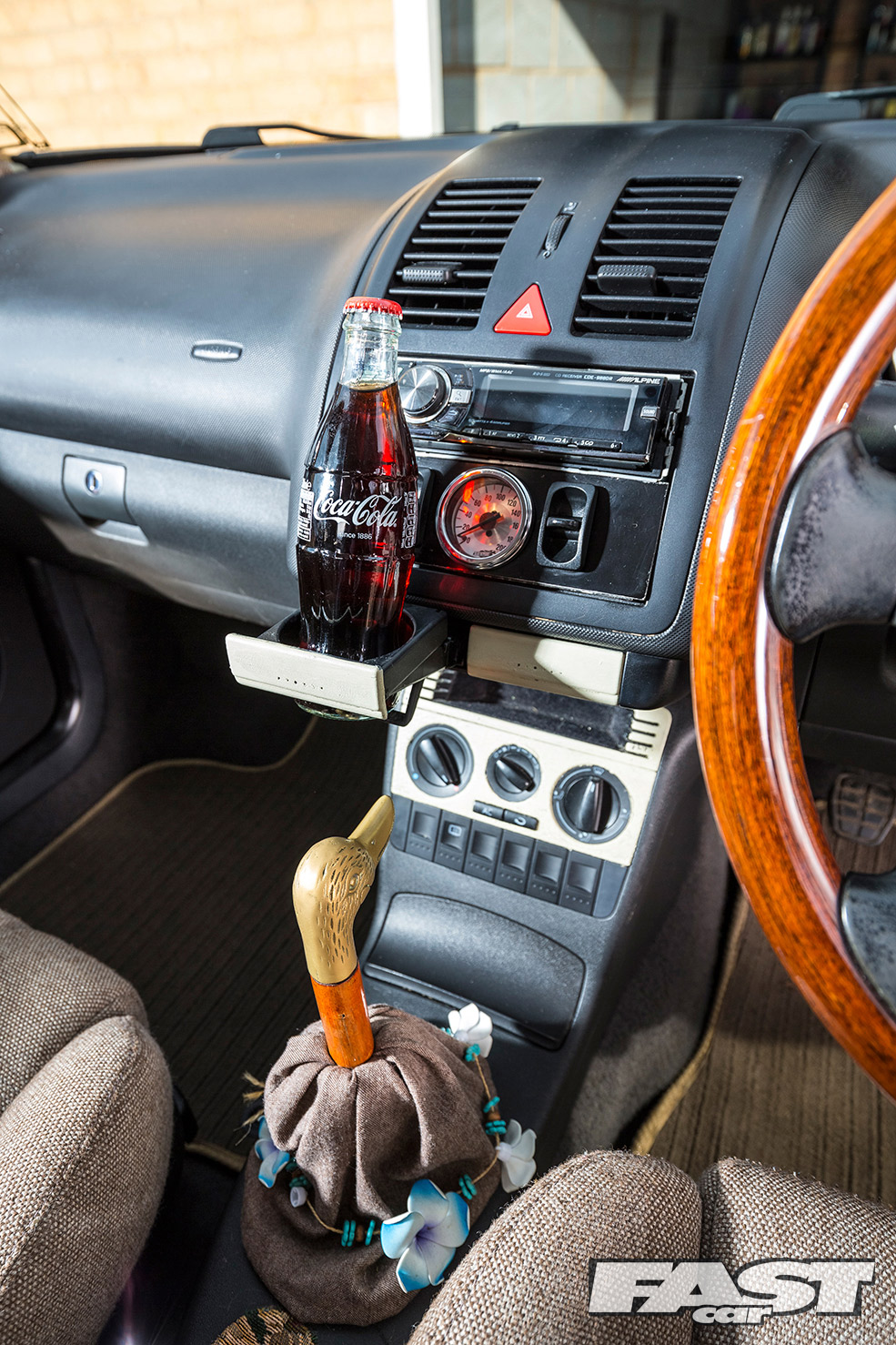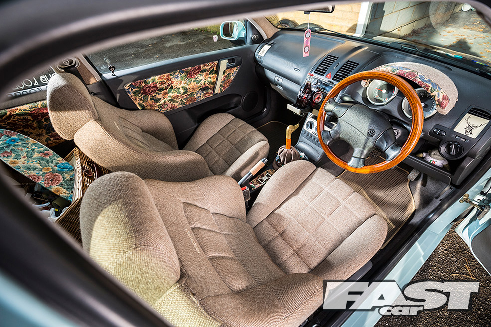 First of all, he’s a hairdresser from Brighton who takes great pleasure in getting parts from Germany addressed to Herr Dryer (yep, even I couldn’t make that shit up). Secondly, his girlfriend’s dad owns a 1970’s caravan with a sofa in the exact same pattern as his doorcards. And finally, he’s taken the idea of a budget home-brew build to the extreme every step of the way. Look at it like this, not only is this Polo put together for well under 5-grand, almost entirely on his tips from Toni & Guy. But, back in the day, he’s even been known to spend weeks eating nothing but three square meals of Cup-a-Soup a day to be able to afford stuff like the genuine VW Colour Concept seats. That’s some supreme dedication for ya’.