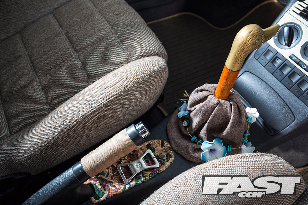 Mk4 Golf V5 front seats trimmed in tweed, biscuit stitching, floral accenting and doorcards, duck walking stick, VW key door pins, lazer cut stag air vents, rare wooden steering wheel.