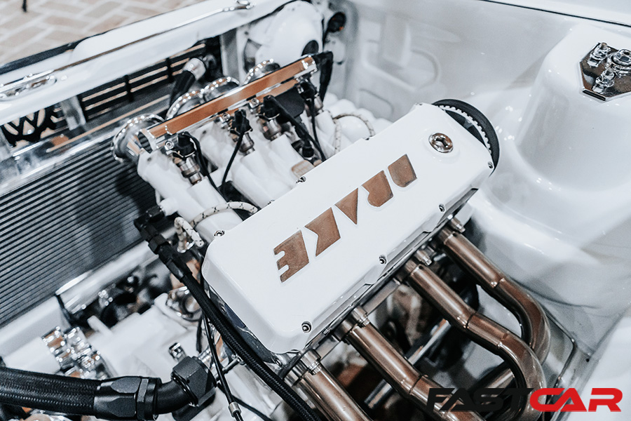 In May of 2019, the truck was sent off to someone many of us are familiar with – Matt at Eurokraft – to take care of the wiring, as well as bringing the motor to life. “One year later he sent me a video of the engine running,” smiles Forest “[It was] music to my ears.” Let’s pause a moment to really study that engine. You’d be forgiven for not being able to identify its ABA roots. Out back, the exhaust manifold is the artistry of Swoops while the ITBs are Borlas. The crown jewel of the bay is the Drake valve cover, one of allegedly four in existence.