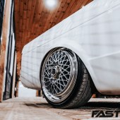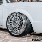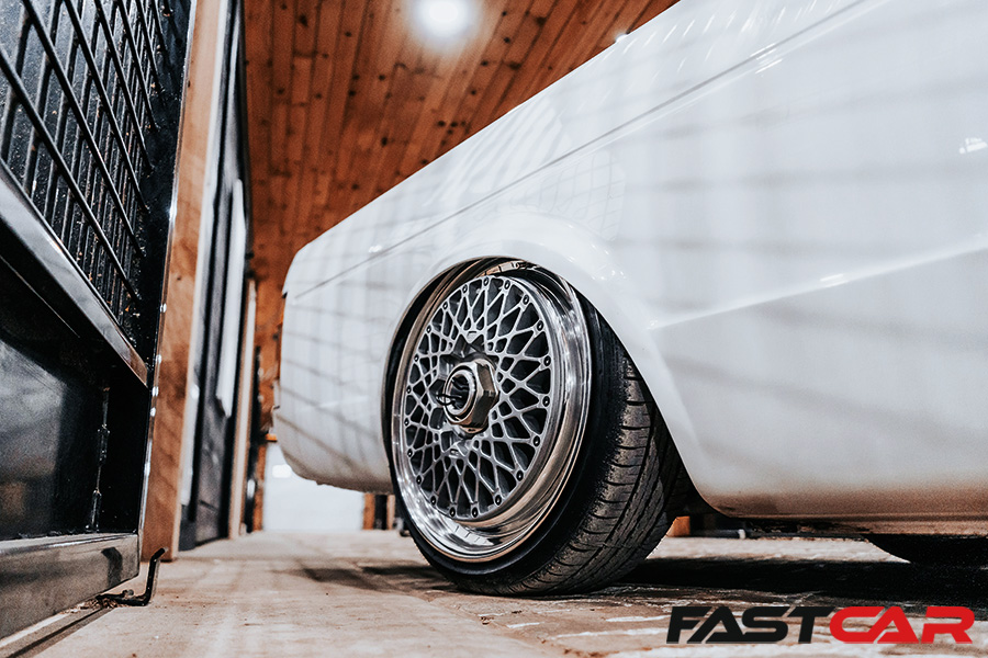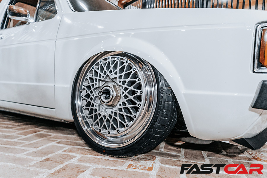 Once the modified VW Rabbit Pickup was picked up from Eurokraft, it took another few months to get the suspension dialed in. There are modified Mk3 Air Lift front struts to complement the 4-link rear, all controlled by Air Lift’s 3P management. All conspire to allow perfect placement in the arches for the BBS E48s. The Caddy wasn’t always rolling on the center-lock magnesium wheels though. “When I had first started the build in 2013, the trend was fender sitting on wheel lip with gnarly-ass stretched tires,” jokes Forest. “That’s what I was initially going for with my 15” RSs. Time went on and I saw a few Mk1s popping up with 17s. I wanted to tuck 17s, so I searched for company’s that made step lips for 15” RSs. Wheel Flip had what I needed. I finished the build with those wheels and had those on till July 2021.”