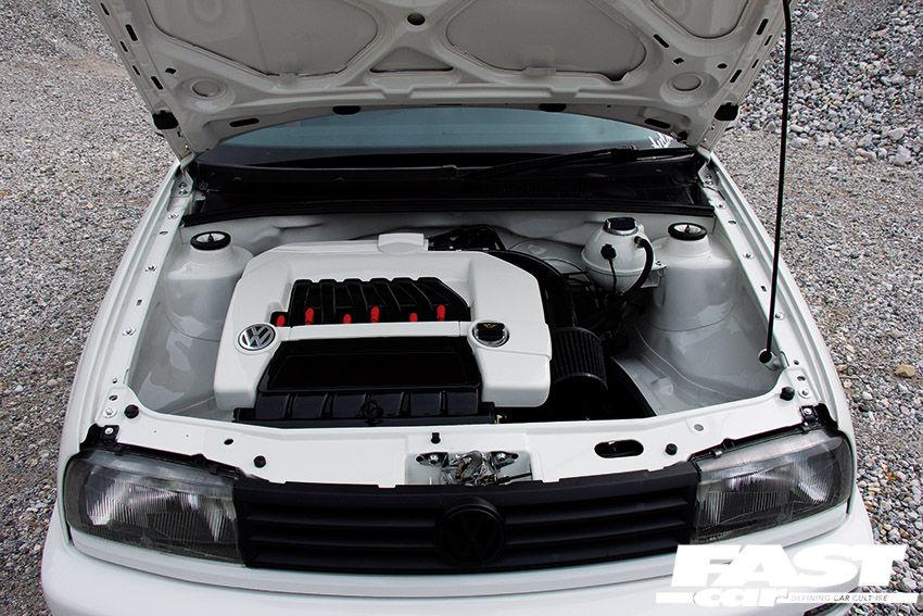 3189cc, 24-valve VR6 (BHE) from Audi TT, Milltek exhaust manifold, custom intake, custom tucked wiring loom, VR6 five-speed gearbox, Sachs performance clutch, Polo shifter and Mk5 linkage, smoothed engine bay with relocated power steering apr, battery and deleted AC, colour coded engine cover, Audi R8 oil and coolant cap, chrome bonnet