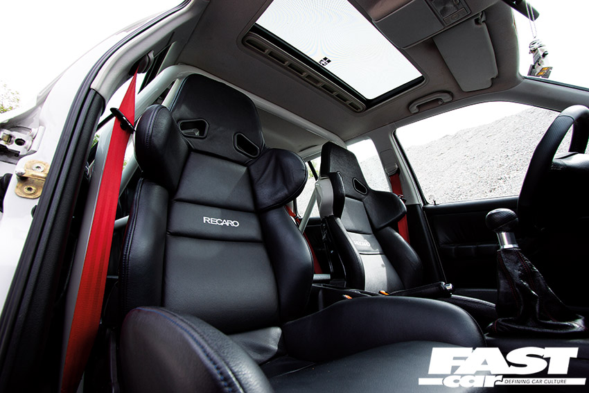 Recaro A8 black leather front seats with colour coded backs, Vento rear bench trimmed to match, Mk4 Cabrio dashboard, colour coded Weichers Sport half cage, custom red seatbelts, Mk4 Golf steering wheel, VR6 instruments with white dials, Storm Trooper lock pins, Golf 3 GTI gear knob, custom mats with white piping