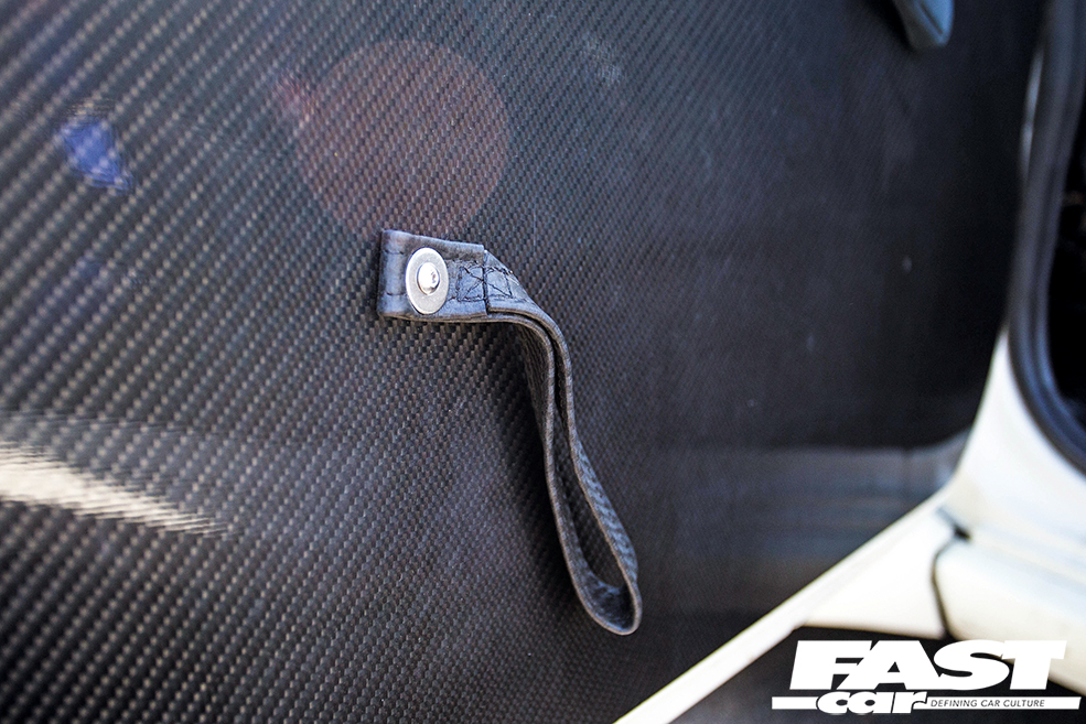 Recaro (driver’s) and Motordrive (passenger’s) fixed-back bucket seats, Nicky Grist harnesses, welded-in six-point roll cage, ETB digi-dashboard, removable suede steering wheel, 60-litre boot-mounted fuel tank, carbon fibre door cards and glovebox cover.