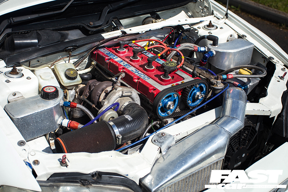 Just what was it that he was so keen to get his hands on, then? It only takes the popping of the bonnet to explain the answer. You see, crammed in that dainty engine bay happened to be a YB Cosworth engine, sitting in a longitude fashion that implied the matching running gear has also been transferred over to power all four wheels. No wonder that wide Dimma rally kit had also been added!
