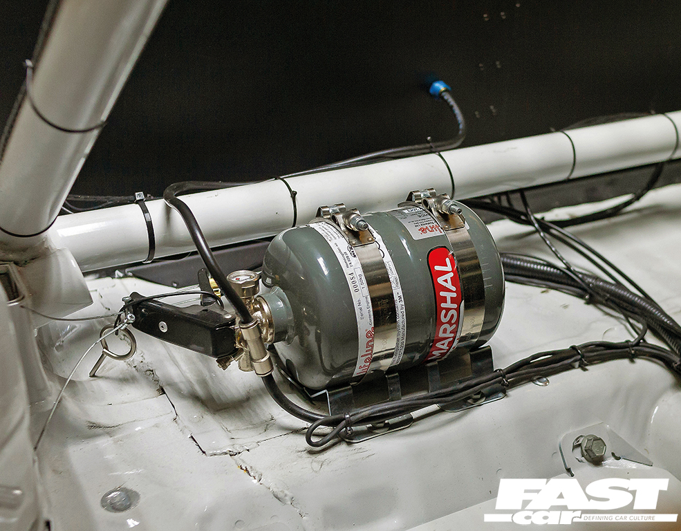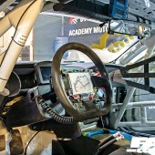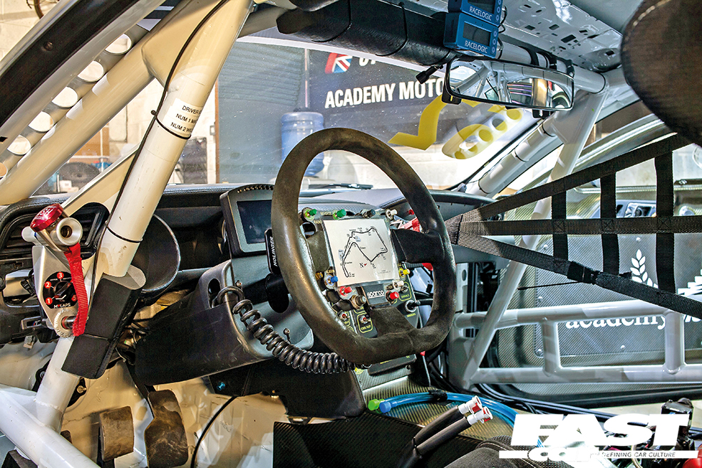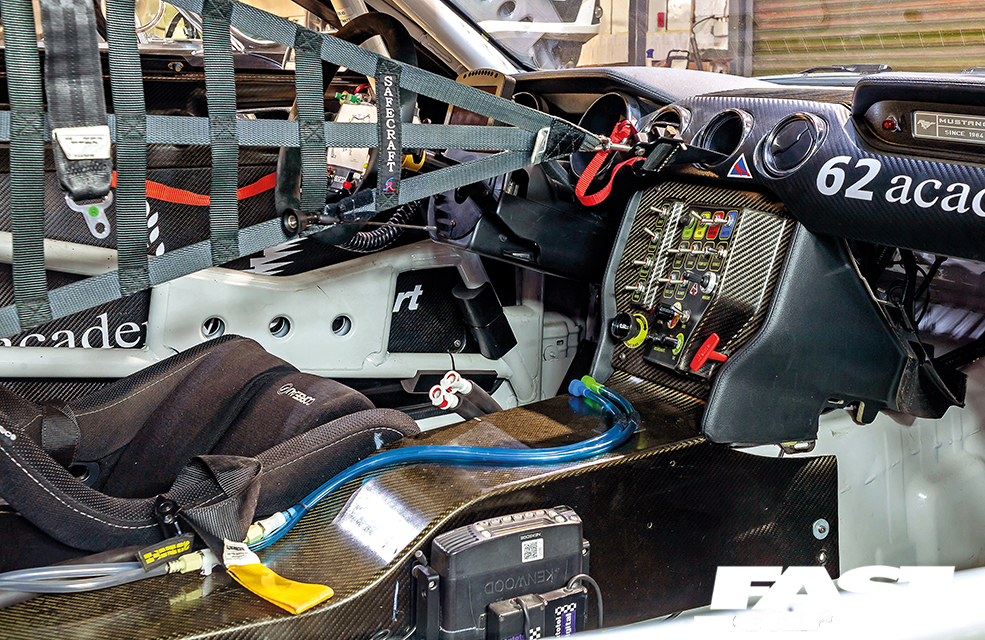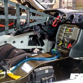 FIA-compliant roll cage structure, plumbed-in fire extinguisher, six-point harness, FIA-homologated adjustable race seat and adjustable steering column, driver coolsuit and drinking water supply, car-to-pit radio communication system, carbon fibre trim panels, MoTeC race-oriented dash logger for full data analysis