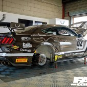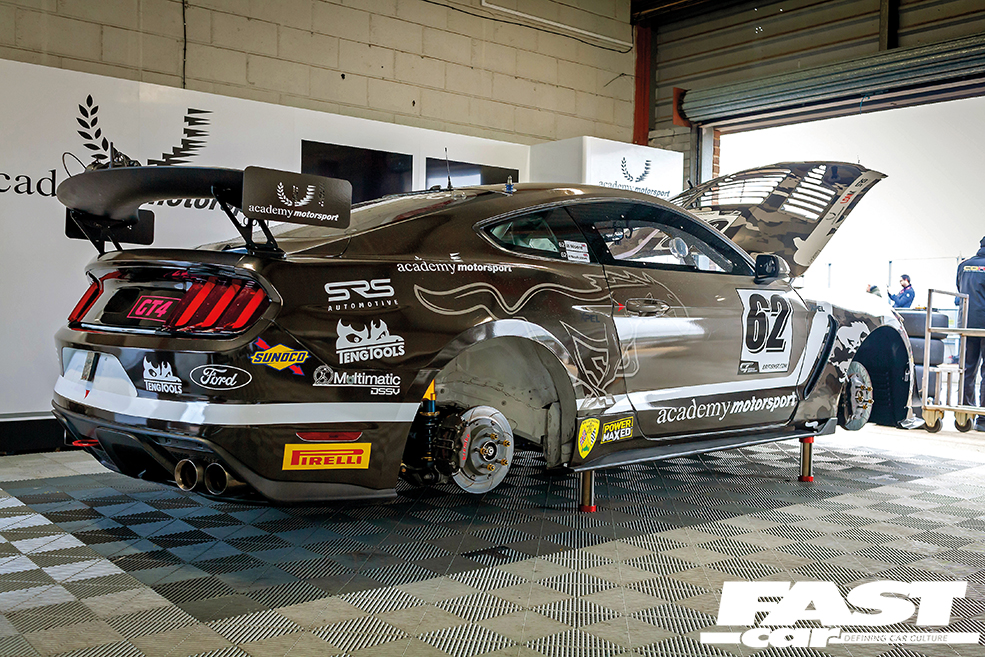 Like most British GT race cars, Academy’s Mustangs are body-wrapped. Academy’s is a distinctive grey and white ‘galloping pony’ Rob Weston design, applied across the team’s transporters and race cars at SRS Automotive.