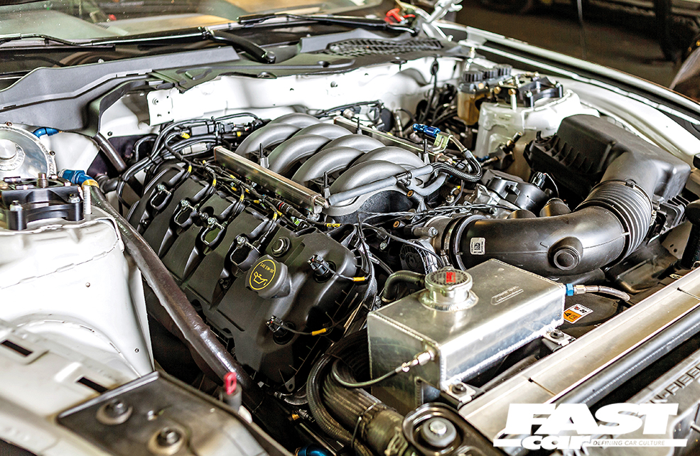 Naturally-aspirated Coyote 4951cc DOHC 32-valve V8 with aluminium block and heads, cast aluminium pistons, forged steel con rods, 11:1 compression ratio, sequential multi-port fuel injection, stainless steel tubular exhaust manifolds and twin-exit system