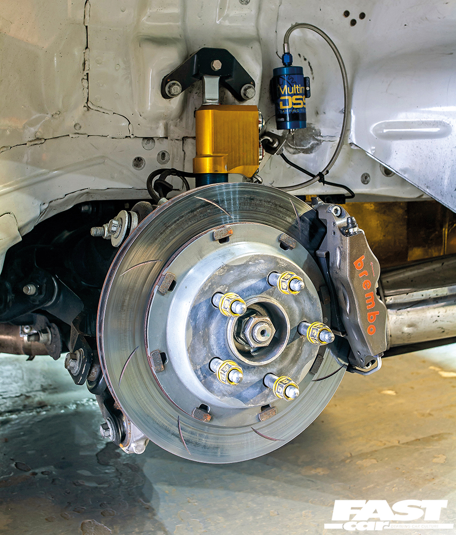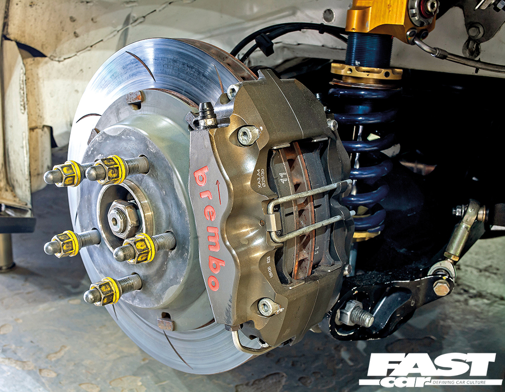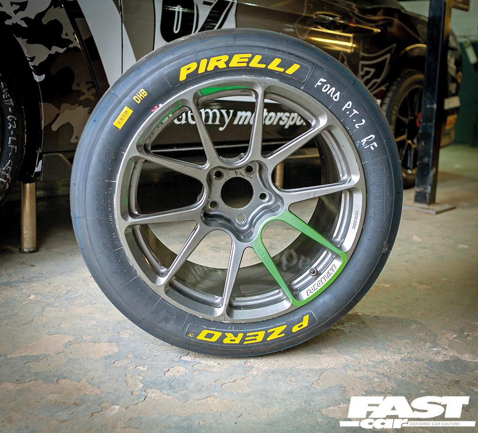 All UK GT Mustangs are equipped with 380mm front discs and six-pot Brembo brakes, which are plenty for spirited road and occasional track use. The rear stoppers are standard Ford parts, which can be relaxed if the standard-fit line-lock feature is deployed. The race car gets Brembo six-piston front and four-pot rear callipers with fully-floating, slotted discs.