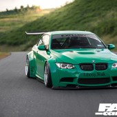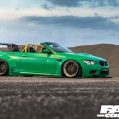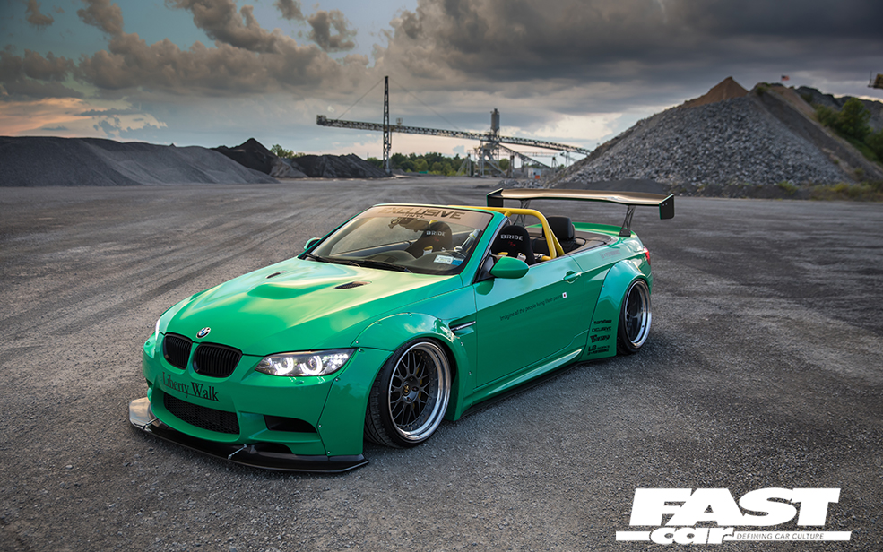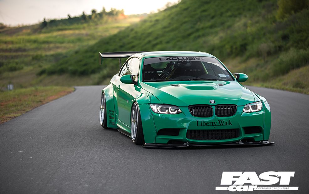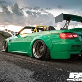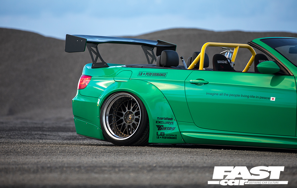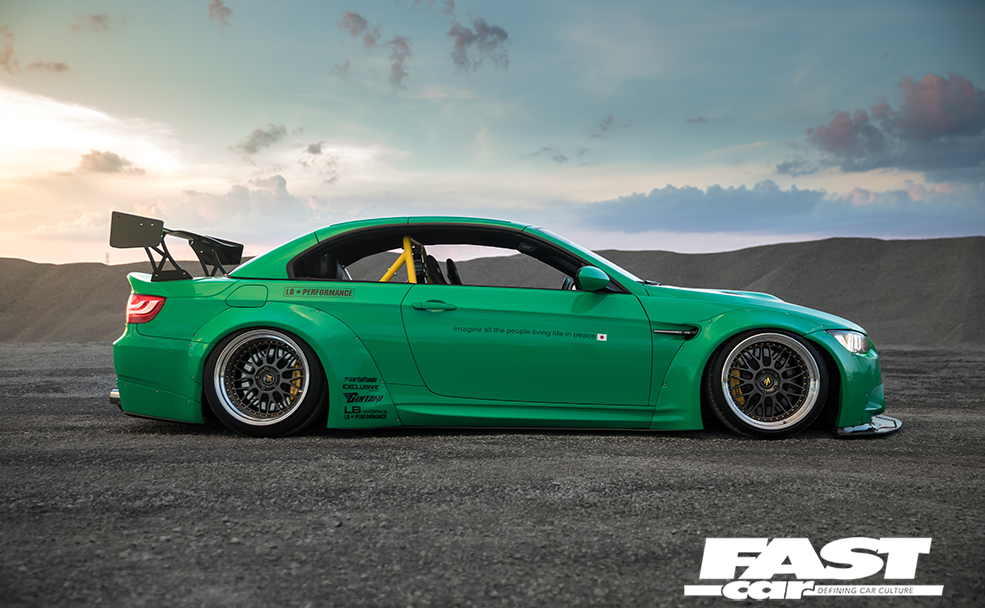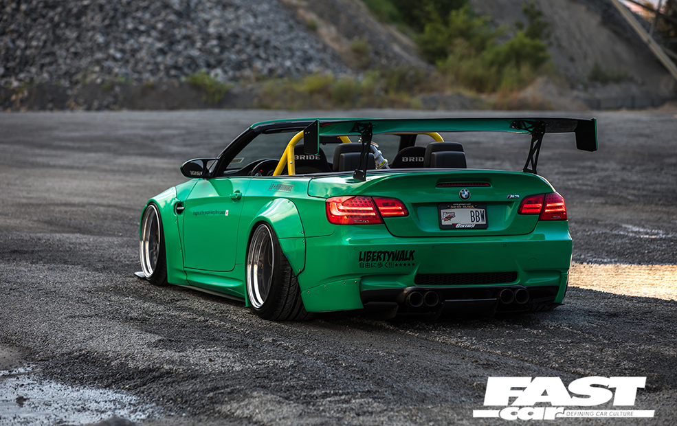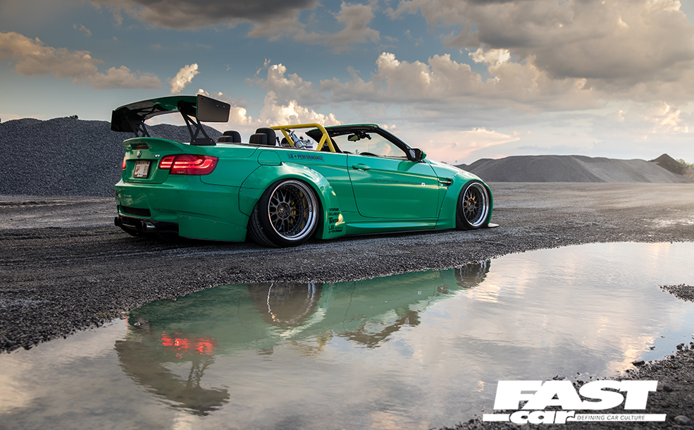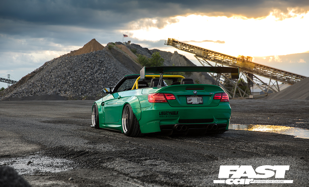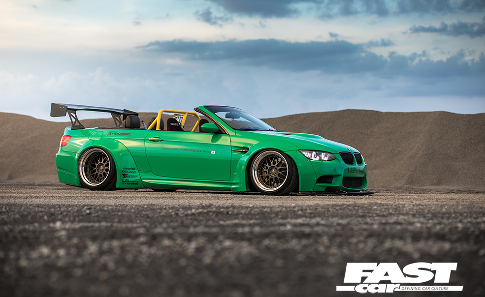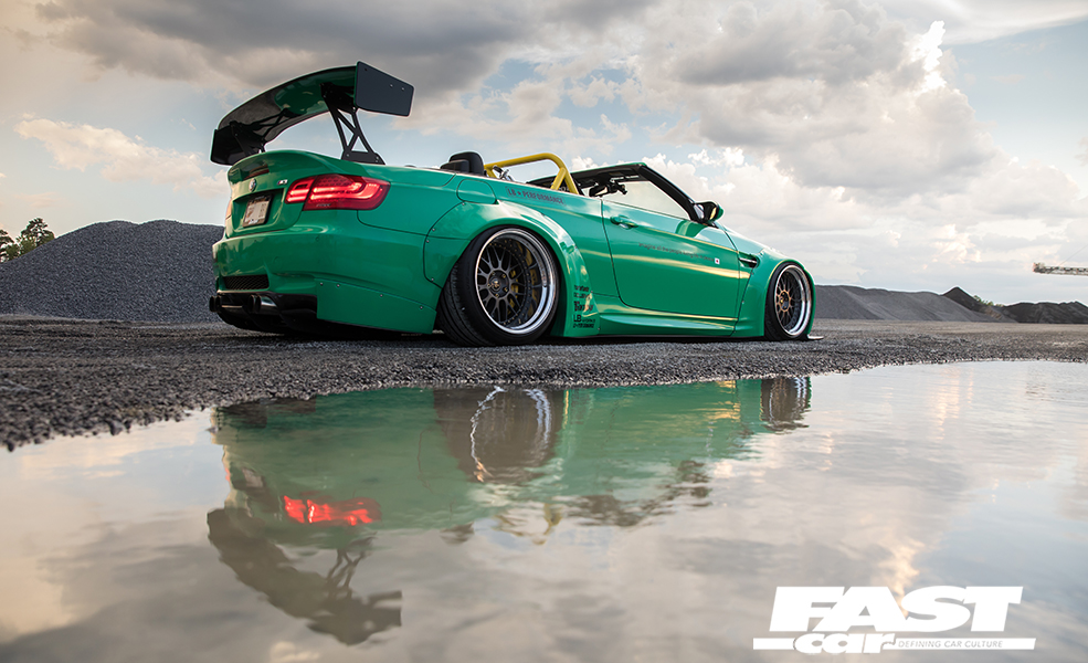 There’s no point attempting to beat about any bushes of any kind because the main component of phase two was what you see in all the pictures, boldly and unashamedly slapping you in the face with its outrageous width and taking this M3 from mild to wild, and that’s the Liberty Walk body kit. Love it or hate it, you can’t deny that it makes a big impact and turns heads like nobody’s business, cranking this M3’s styling concept up to 11. “After I decided to go with a wide-body build, I had two options I could choose from: either a sleek, subtle design (for example: flat duckbill spoiler and a dark, satin vinyl wrap) or a wild design – I think I ultimately opted for the latter,” says Auvee with masterful understatement and we’d second that. “Roman from Exclusive Vinyl was critical to the design of my build,” he continues. “We ran into a few problems along the way, primarily with installation of the wide-body kit, due to the fact that the E93 chassis differs from the E92 chassis, but Exclusive Vinyl got the job done for me in time for the car’s first show, where it won two awards (Best Euro and Best BMW).” Of course, fitting the kit was all well and good but Auvee needed a hit of something extra to really push the envelope as far as it could possibly go – and then a little further still – and that was the colour. Subsequently, the car has been wrapped in Signal green, originally a Porsche colour, and it’s absolutely awesome. It’s a solid shade that’s a visual smack in the face, that makes such a nice change from your usual colour suspects and which works so very well not just with the kit and the wheels but with the whole look of the car. In fact, we’d go so far as to say that opting for such an eyeball-slapping shade was a master stroke that brings all of the elements together. We mentioned that the Brombachers’ three-piece build meant that they could grow with the car and now, via a set of serious lips, the 19s have been widened to a mighty 11” up front and a frankly scary 14” at the back, wrapped in similarly ridiculously wide rubber all-round, and absolutely necessary in order to fill out those absolutely enormous arches, which they do with aplomb.