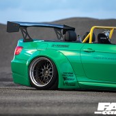Liberty Walk wide-body kit, full exterior wrap in Porsche Signal green, Mod Emporium custom carbon headlights, carbon side repeaters, Aeroflow Dynamics carbon side skirt extensions, Vorsteiner carbon boot lid, Battle Aero wing with custom end plates, Varis upper and lower carbon rear diffuser