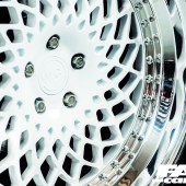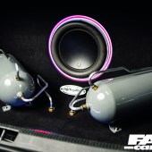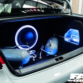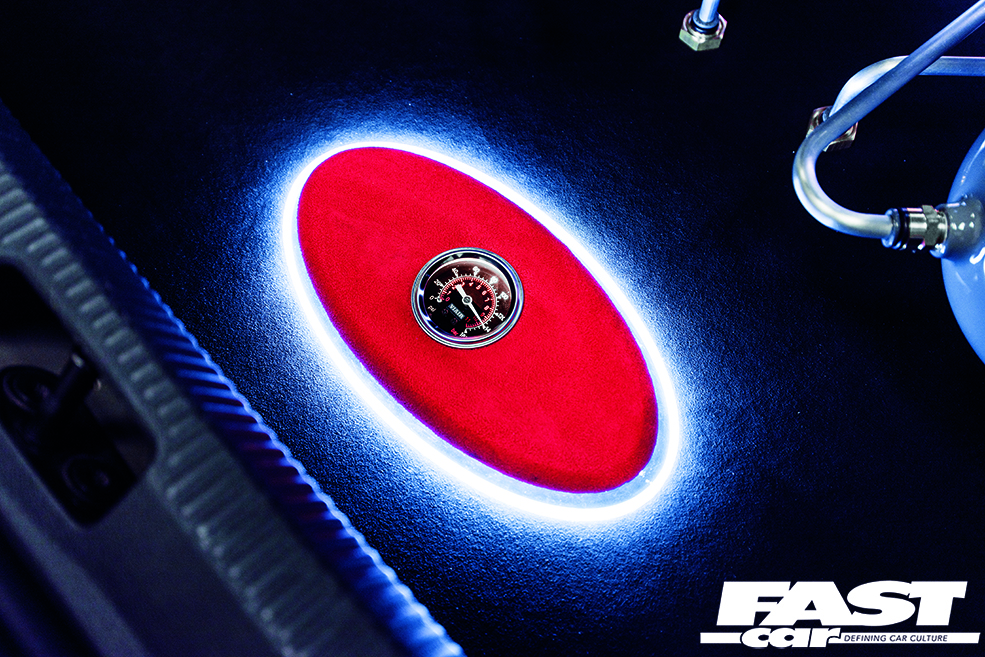 The boot build was not something done in the garage at home though, as you can probably tell from how sweet it looks it’s a pro job done by none other than the suppliers of the kit itself, Only Charged Dubs. The guys also chassis-notched the front end while the boot build was being built, and the results of all their hard work is plain to see. The twin three-gallon stubby air tanks sit in front of the other thing that draws your eye in the boot, the 12” JL Audio W7 sub-woofer mounted at the back of the trunk. That, along with the hardlines and the subtle LED lighting are all Only Charged Dubs doing too.