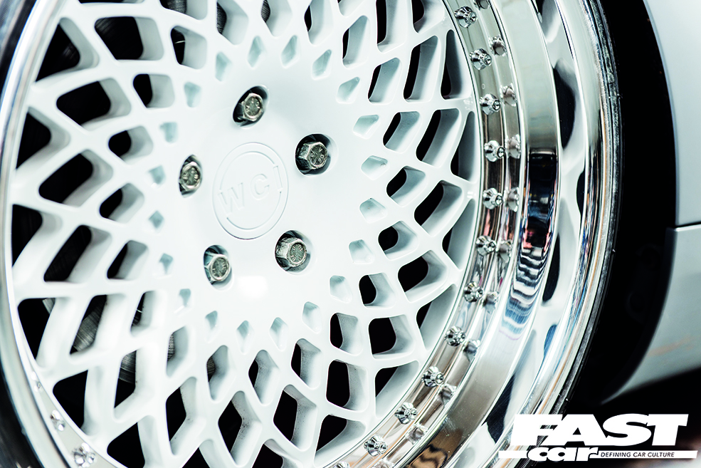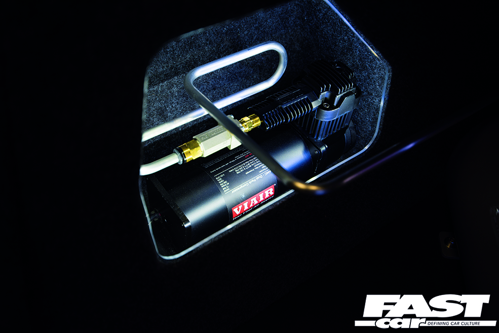 Steve had barely removed his dad’s CDs from the glovebox before he got on the phone to the guys at Only Charged Dubs and ordered a kit. The car sits on Air Lift Slam Series struts hooked up to V2 management with fixed 2.5 degree top mounts. “We got the kit and in an afternoon in my garage with my mates we had it fitted,” said Steve. “I’ve had my hand in a lot of things on this car,” he added. “Fitting the air, building the wheels up, fabricating the seat mounts and the strip down and paint prep,” he continued. “I can’t take credit for all of it of course, having a group of mates with the skills and knowledge to get things done was a big thing and I can’t thank them enough.”