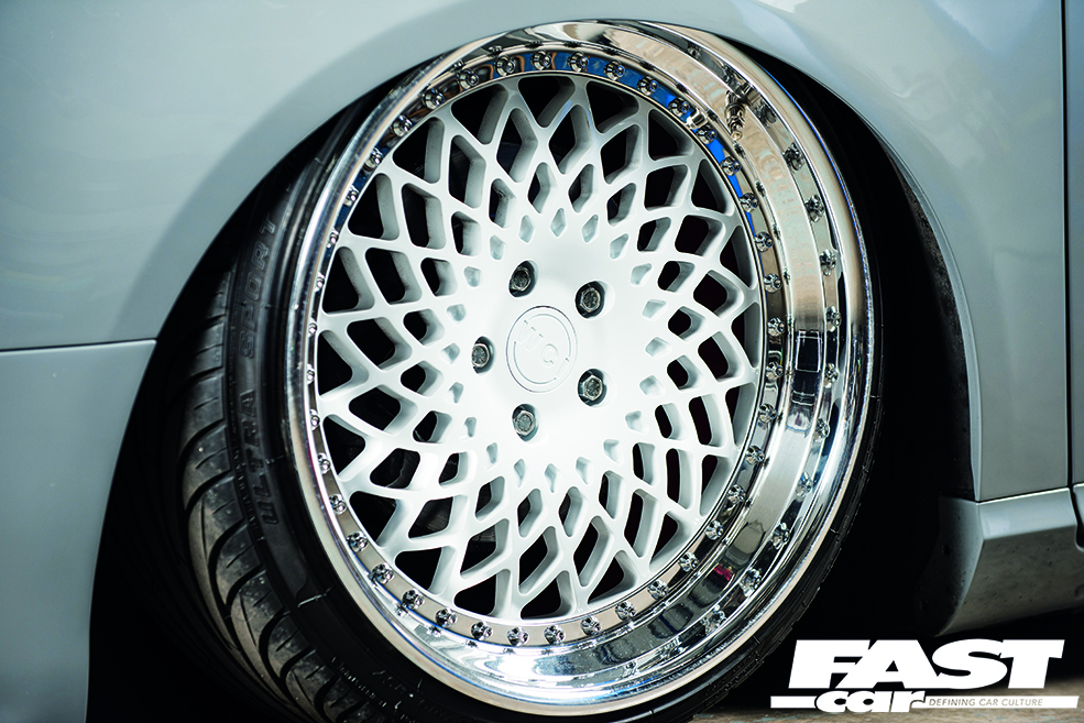 The car sat on a few different sets of wheels prior to picking up the WatercooledIND wheels, the previous favourites being a set of two-piece ZH ZW4s. The current three-piece MT10s that the car sits on now measure in at 9.5×19” and 10×19” front and rear respectively and really pop against the Nardo grey paint with their white faces, powder-coated red barrels and super shiny lips which were done by Pugz Polishing.