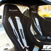 Half-stripped with sound deadening removed, Pandem carbon fibre bucket seats on Planted brackets, 6-point harnesses, custom GPP four-point rollcage, GReddy turbo timer, polished gearknob, GPP leather steering wheel, custom aluminium foot panels, blue trim converted to black