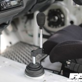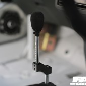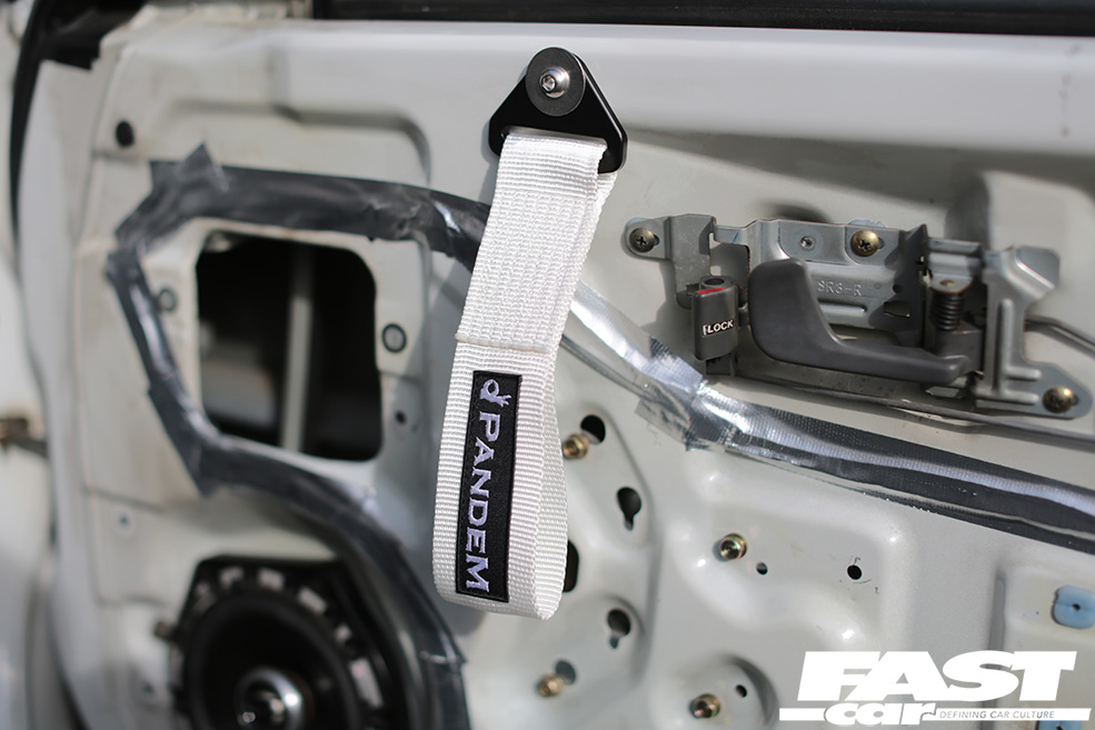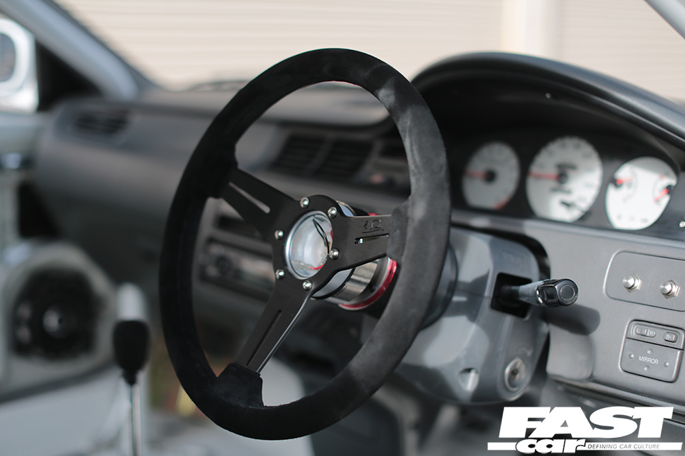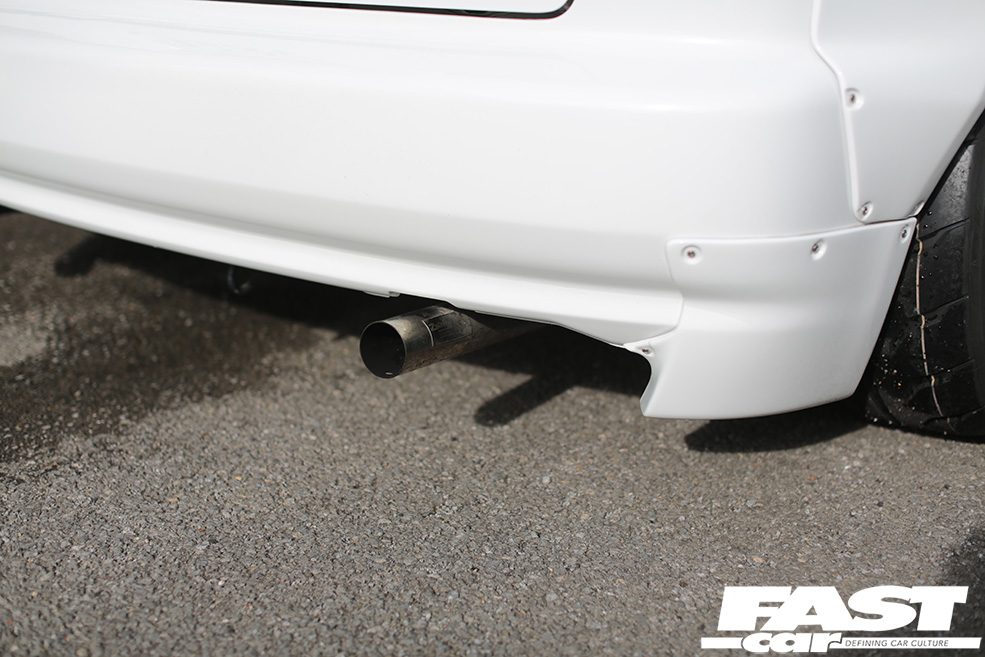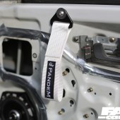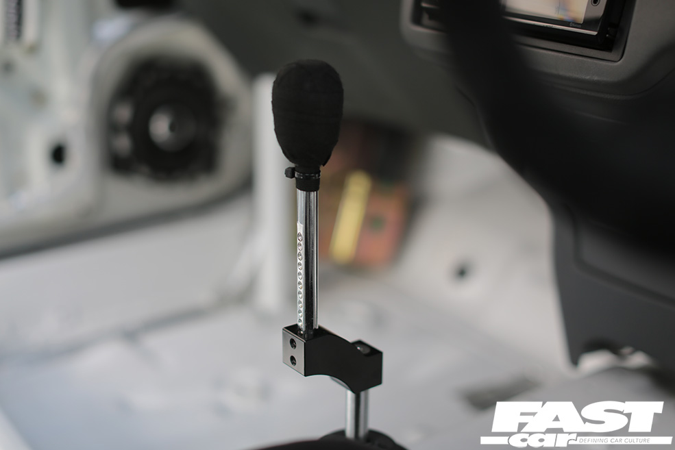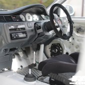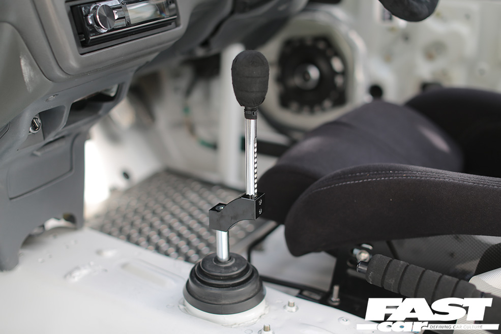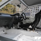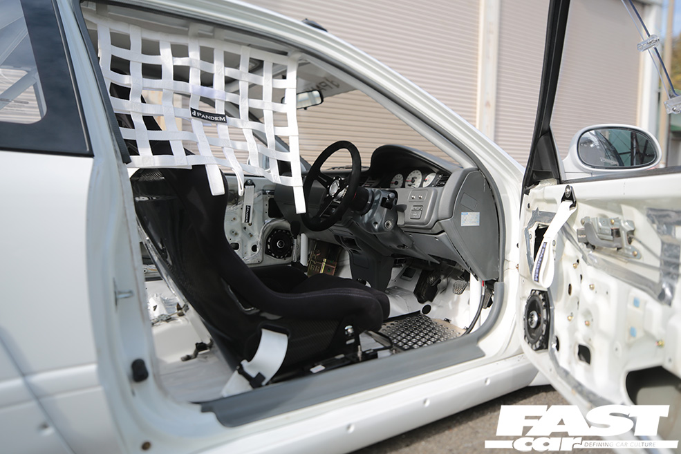 Swing open the drivers’ side door and it instantly becomes obvious that this build has been thoroughly thought through. The entire cabin has been stripped to the bare metal and only a single Pandem bucket sits in the expanse of white that meets the eye. A roll cage has been thrown in to boost both torsional rigidity and safety while we do like the extended shift leaver set up and the Pandem door pulls.