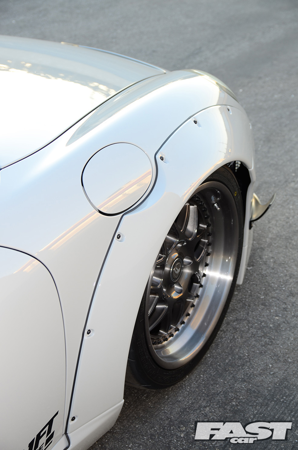 What really defines the build, however, are those outrageous aesthetics. The Pandem widebody kit pretty much jabs you in the eye with a wedge of lemon, doesn’t it? “The fun part was that the kit was designed for the earlier 987.1, while my car is a facelifted 987.2,” Andrew points out. “This meant that we had to do quite a lot of modifying and reworking, from altering the bumper fitment to extensively readjusting the suspension to work with the lines of the kit. We also had a hard time with the wheels, because they’re very wide and we still wanted to achieve full steering lock. But Long and his team were able to pull it all off, and the car was ready for SEMA as intended.”
