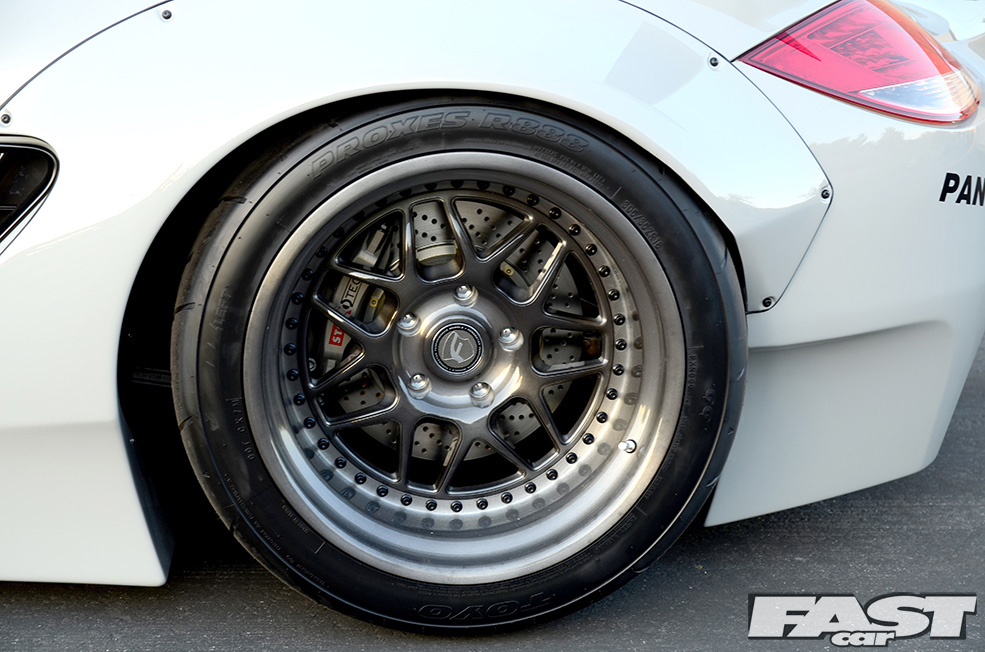 And so, with the help of all these sponsors pulling together toward the SEMA goal, along with the proven expertise of LTMW, the spec list began to take shape. Piece by piece, the Cayman climbed up the ladder of awesome toward the fluffy clouds of victory. A set of KW shocks were mated with a custom air-ride setup courtesy of Air Lift, while the brakes were exponentially beefed up by StopTech BBKs at either end. Naturally it had to run Forgestar wheels, so a set of M14s were chosen in staggered widths – 10×18” up front, and a meaty 13×18” out back – all slathered in sticky Toyo R888s.